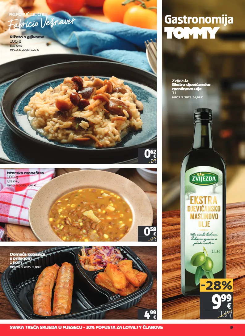 svaka treća srijeda u mjesecu - 10% popusta za loyalty članove 9 gastronomija rižoto s gljivama 100 g 6,19 €/kg mpc 2. 5. 2025.: 7,29 € preporučuje chef 0 62 0 73 zvijezda ekstra djevičansko maslinovo ulje 1 l mpc 2. 5. 2025.: 14,99 € 9 99 13 99 -28% istarska maneštra 100 g 5,79 €/kg mpc 2. 5. 2025.: 6,95 € 0 58 0 70 4 99 domaća kobasica s prilogom 1 kom mpc 23. 8. 2025.: 5,00 €