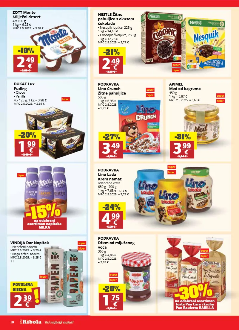 10 super hiper super hiper super hiper super hiper hiper hiper zott monte mliječni desert 4 x 100 g 1 kg = 6,23 € mpc 2.5.2025. = 3,58 € podravka lino crunch žitne pahuljice 500 g 1 kg = 6,98 € mpc 2.5.2025. = 5,75 € podravka lino lada krem namaz odabrane vrste 650 g - 700 g 1 kg = 7,68 € - 7,13 € mpc 2.5.2025. = 7,75 € podravka džem od miješanog voća 360 g 1 kg = 4,86 € mpc 2.5.2025. = 2,63 € dukat lux puding • choco • vanilla 4 x 125 g, 1 kg = 3,98 € mpc 2.5.2025. = 2,39 € -19% 2 49 3,09 € -20% 1 99 2,49 € -27% 3 49 4,79 € super hiper nestle žitne pahuljice s okusom čokolade • nesquik loptice, 225 g 1 kg = 14,18 € • chocapic školjkice, 250 g 1 kg = 12,76 € mpc 2.5.2025. = 3,71 € -21% 2 49 3,19 € -24% 4 99 6,59 € -20% 1 75 2,19 € super hiper apimel med od bagrema 450 g 1 kg = 8,87 € mpc 2.5.2025. = 6,63 € -31% 3 99 5,84 € -15% -15% na odabrani asortiman napitaka milka -30% -30% na odabrani asortiman tosta pan care i kruha pan bauletto barilla super hiper hiper vindija dar napitak • neprženi badem mpc 2.5.2025. = 3,79 € • blago prženi badem mpc 2.5.2025. = 3,25 € 1 l 2 39 ! ! povoljna cijena