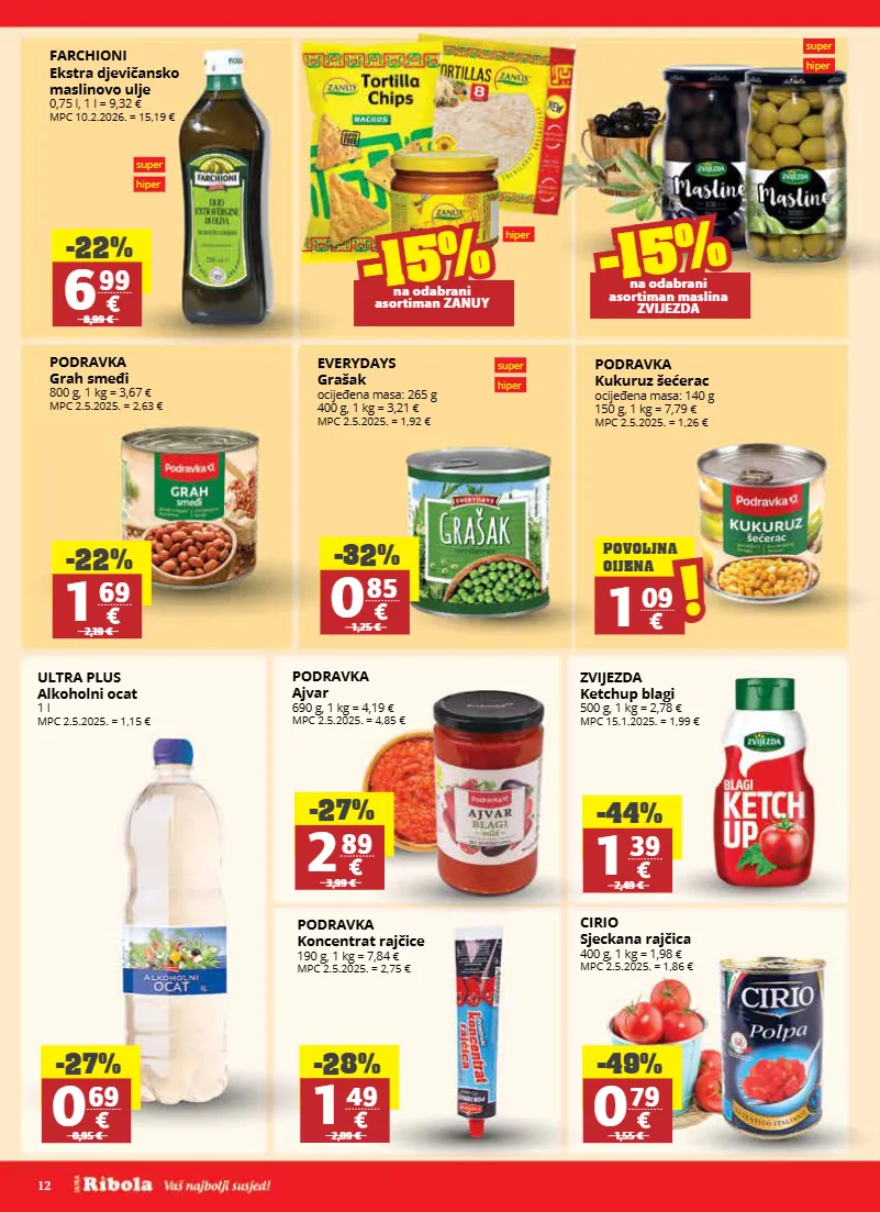 12 super hiper hiper farchioni ekstra djevičansko maslinovo ulje 0,75 l, 1 l = 9,32 € mpc 10.2.2026. = 15,19 € podravka kukuruz šećerac ocijeđena masa: 140 g 150 g, 1 kg = 7,79 € mpc 2.5.2025. = 1,26 € podravka ajvar 690 g, 1 kg = 4,19 € mpc 2.5.2025. = 4,85 € zvijezda ketchup blagi 500 g, 1 kg = 2,78 € mpc 15.1.2025. = 1,99 € cirio sjeckana rajčica 400 g, 1 kg = 1,98 € mpc 2.5.2025. = 1,86 € podravka koncentrat rajčice 190 g, 1 kg = 7,84 € mpc 2.5.2025. = 2,75 € ultra plus alkoholni ocat 1 l mpc 2.5.2025. = 1,15 € everydays grašak ocijeđena masa: 265 g 400 g, 1 kg = 3,21 € mpc 2.5.2025. = 1,92 € -22% 6 99 8,99 € -32% 0 85 1,25 € -27% 2 89 3,99 € -44% 1 39 2,49 € -49% 0 79 1,55 € -28% 1 49 2,09 € -27% 0 69 0,95 € -15% -15% na odabrani asortiman zanuy super hiper super hiper -15% -15% na odabrani asortiman maslina zvijezda 1 09 ! ! povoljna cijena podravka grah smeđi 800 g, 1 kg = 3,67 € mpc 2.5.2025. = 2,63 € -22% 1 69 2,19 €