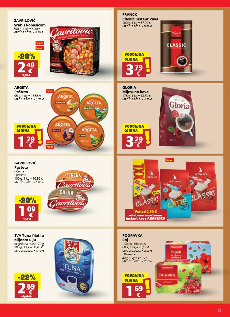 13 super hiper hiper hiper argeta pašteta 95 g, 1 kg = 13,58 € mpc 2.5.2025. = 1,72 € gavrilović pašteta • čajna • jetrena 100 g, 1 kg = 10,90 € mpc 2.5.2025. = 1,89 € eva tuna fileti u biljnom ulju ocijeđena masa: 70 g 100 g, 1 kg = 38,43 € mpc 2.5.2025. = 4,19 € franck classic instant kava 100 g, 1 kg = 37,90 € mpc 2.5.2025. = 5,49 € gloria mljevena kava 175 g, 1 kg = 18,80 € mpc 2.5.2025. = 4,99 € podravka čaj • šipak i hibiskus 60 g, 1 kg = 28,17 € mpc 2.5.2025. = 2,55 € • brusnica 40 g, 1 kg = 42,25 € mpc 2.5.2025. = 2,59 € -28% 1 09 1,52 € -22% 2 69 3,49 € 1 29 ! ! povoljna cijena 3 79 ! ! povoljna cijena 3 29 ! ! povoljna cijena 1 69 ! ! povoljna cijena već od 2,49 € odabrani asortiman instant kava arabesca gavrilović grah s kobasicom 300 g, 1 kg = 8,30 € mpc 2.5.2025. = 4,19 € -28% 2 49 3,49 € super hiper