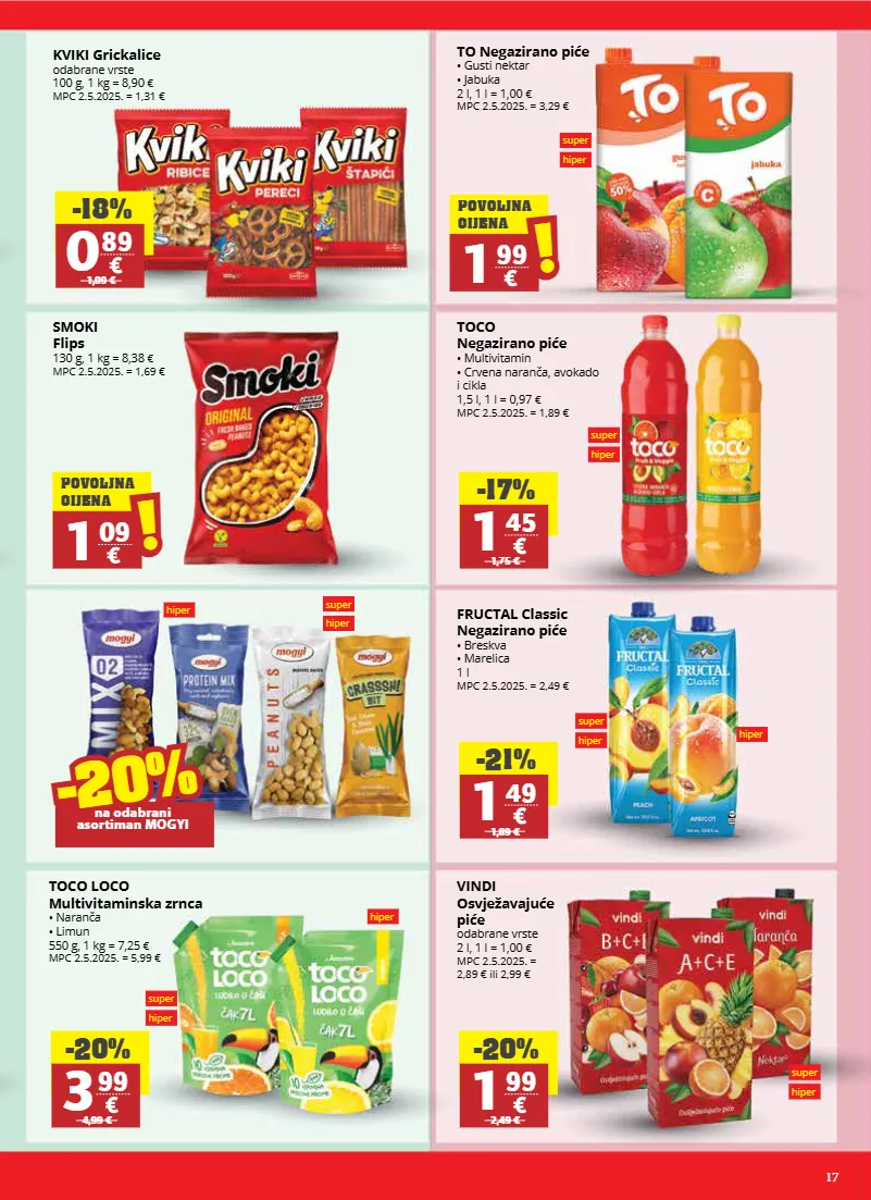17 super hiper super hiper super hiper super hiper super hiper super hiper super hiper super hiper super hiper super hiper hiper hiper hiper kviki grickalice odabrane vrste 100 g, 1 kg = 8,90 € mpc 2.5.2025. = 1,31 € smoki flips 130 g, 1 kg = 8,38 € mpc 2.5.2025. = 1,69 € vindi osvježavajuće piće odabrane vrste 2 l, 1 l = 1,00 € mpc 2.5.2025. = 2,89 € ili 2,99 € toco loco multivitaminska zrnca • naranča • limun 550 g, 1 kg = 7,25 € mpc 2.5.2025. = 5,99 € fructal classic negazirano piće • breskva • marelica 1 l mpc 2.5.2025. = 2,49 € toco negazirano piće • multivitamin • crvena naranča, avokado i cikla 1,5 l, 1 l = 0,97 € mpc 2.5.2025. = 1,89 € -18% 0 89 1,09 € -20% 1 99 2,49 € -21% 1 49 1,89 € -20% 3 99 4,99 € -17% 1 45 1,75 € -20% -20% na odabrani asortiman mogyi super hiper super hiper to negazirano piće • gusti nektar • jabuka 2 l, 1 l = 1,00 € mpc 2.5.2025. = 3,29 € 1 09 ! ! povoljna cijena 1 99 ! ! povoljna cijena