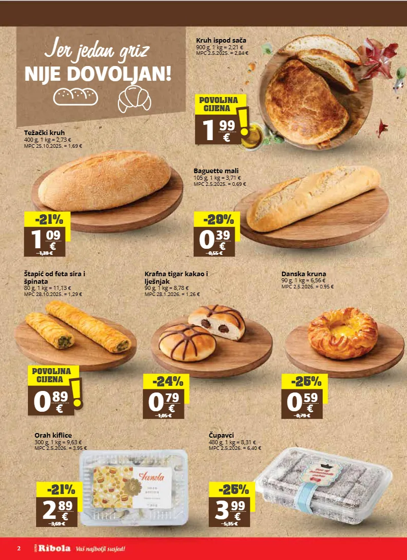 2 jer jedan griz nije dovoljan! 1 99 povoljna cijena ! ! 0 89 povoljna cijena ! ! -21% 1 09 1,39 € -29% 0 39 0,55 € -24% 0 79 1,05 € -25% 0 59 0,79 € -25% 3 99 5,35 € -21% 2 89 3,69 € kruh ispod sača 900 g, 1 kg = 2,21 € mpc 2.5.2025. = 2,84 € težački kruh 400 g, 1 kg = 2,73 € mpc 25.10.2025. = 1,69 € baguette mali 105 g, 1 kg = 3,71 € mpc 2.5.2025. = 0,69 € štapić od feta sira i špinata 80 g, 1 kg = 11,13 € mpc 28.10.2025. = 1,29 € krafna tigar kakao i lješnjak 90 g, 1 kg = 8,78 € mpc 28.1.2026. = 1,26 € danska kruna 90 g, 1 kg = 6,56 € mpc 2.5.2026. = 0,95 € orah kiflice 300 g, 1 kg = 9,63 € mpc 2.5.2026. = 3,95 € čupavci 480 g, 1 kg = 8,31 € mpc 2.5.2026. = 6,40 €