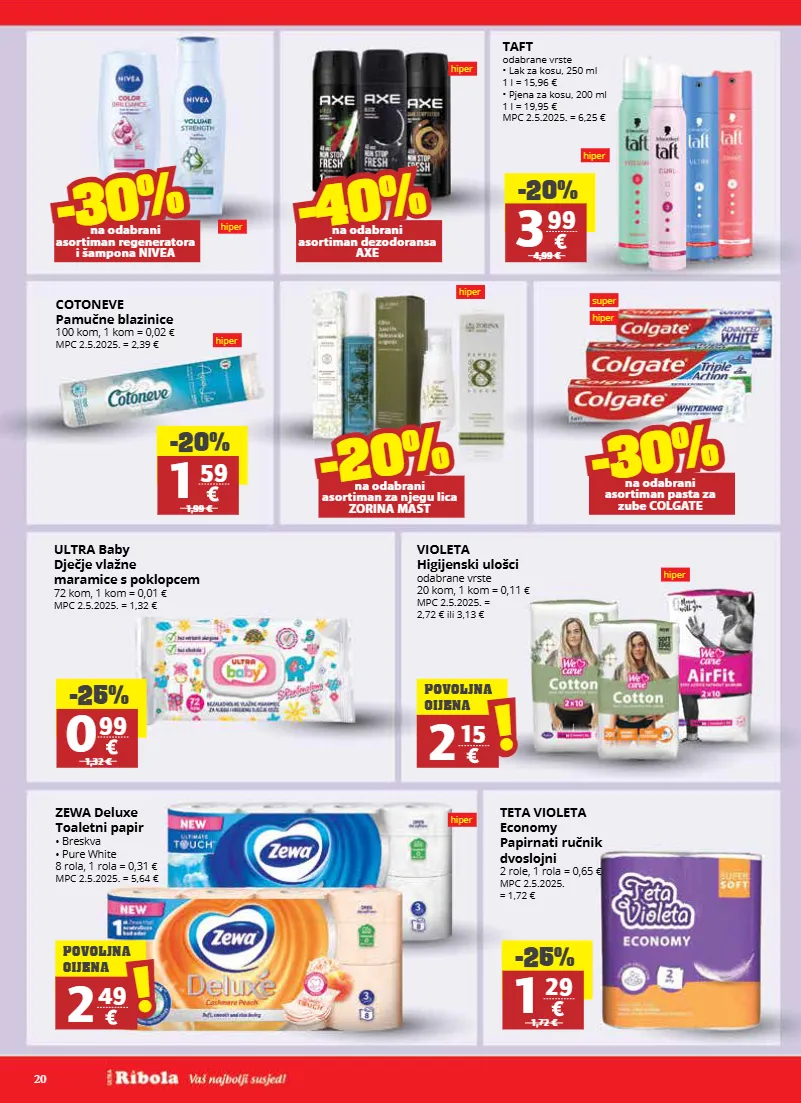 20 super hiper hiper hiper hiper hiper hiper hiper hiper cotoneve pamučne blazinice 100 kom, 1 kom = 0,02 € mpc 2.5.2025. = 2,39 € violeta higijenski ulošci odabrane vrste 20 kom, 1 kom = 0,11 € mpc 2.5.2025. = 2,72 € ili 3,13 € zewa deluxe toaletni papir • breskva • pure white 8 rola, 1 rola = 0,31 € mpc 2.5.2025. = 5,64 € ultra baby dječje vlažne maramice s poklopcem 72 kom, 1 kom = 0,01 € mpc 2.5.2025. = 1,32 € teta violeta economy papirnati ručnik dvoslojni 2 role, 1 rola = 0,65 € mpc 2.5.2025. = 1,72 € taft odabrane vrste • lak za kosu, 250 ml 1 l = 15,96 € • pjena za kosu, 200 ml 1 l = 19,95 € mpc 2.5.2025. = 6,25 € -20% 3 99 4,99 € -25% 0 99 1,32 € -25% 1 29 1,72 € -20% 1 59 1,99 € 2 15 ! ! povoljna cijena 2 49 ! ! povoljna cijena -20% -30% na odabrani asortiman regeneratora i šampona nivea -20% -30% na odabrani asortiman pasta za zube colgate -20% -20% na odabrani asortiman za njegu lica zorina mast -40% -40% na odabrani asortiman dezodoransa axe