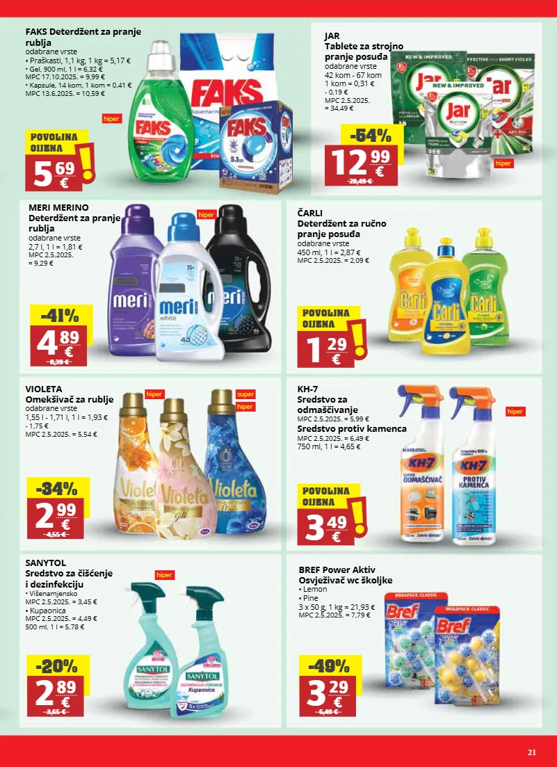 21 hiper faks deterdžent za pranje rublja odabrane vrste • praškasti, 1,1 kg, 1 kg = 5,17 € • gel, 900 ml, 1 l = 6,32 € mpc 17.10.2025. = 9,99 € • kapsule, 14 kom, 1 kom = 0,41 € mpc 13.6.2025. = 10,59 € 5 69 ! ! povoljna cijena 1 29 ! ! povoljna cijena 3 49 ! ! povoljna cijena violeta omekšivač za rublje odabrane vrste 1,55 l - 1,71 l, 1 l = 1,93 € - 1,75 € mpc 2.5.2025. = 5,54 € čarli deterdžent za ručno pranje posuđa odabrane vrste 450 ml, 1 l = 2,87 € mpc 2.5.2025. = 2,09 € kh-7 sredstvo za odmaščivanje mpc 2.5.2025. = 5,99 € sredstvo protiv kamenca mpc 2.5.2025. = 6,49 € 750 ml, 1 l = 4,65 € bref power aktiv osvježivač wc školjke • lemon • pine 3 x 50 g, 1 kg = 21,93 € mpc 2.5.2025. = 7,79 € sanytol sredstvo za čišćenje i dezinfekciju • višenamjensko mpc 2.5.2025. = 3,45 € • kupaonica mpc 2.5.2025. = 4,49 € 500 ml, 1 l = 5,78 € jar tablete za strojno pranje posuđa odabrane vrste 42 kom - 67 kom 1 kom = 0,31 € - 0,19 € mpc 2.5.2025. = 34,49 € hiper meri merino deterdžent za pranje rublja odabrane vrste 2,7 l, 1 l = 1,81 € mpc 2.5.2025. = 9,29 € -41% 4 89 8,39 € -34% 2 99 4,55 € -20% 2 89 3,65 € -49% 3 29 6,49 € -54% 12 99 28,49 € super hiper hiper hiper hiper hiper