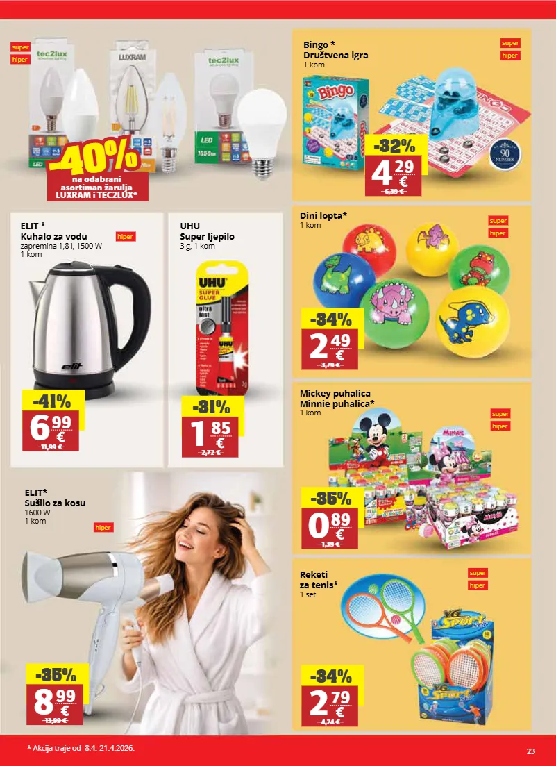 23 super hiper super hiper super hiper super hiper bingo * društvena igra 1 kom dini lopta* 1 kom mickey puhalica minnie puhalica* 1 kom reketi za tenis* 1 set -34% 2 49 3,79 € -35% 0 89 1,39 € -34% 2 79 4,24 € -32% 4 29 6,39 € super hiper hiper elit * kuhalo za vodu zapremina 1,8 l, 1500 w 1 kom uhu super ljepilo 3 g, 1 kom hiper elit* sušilo za kosu 1600 w 1 kom -35% 8 99 13,99 € -31% 1 85 2,72 € -41% 6 99 11,99 € -40% -40% na odabrani asortiman žarulja luxram i tec2lux* * akcija traje od 8.4.-21.4.2026.