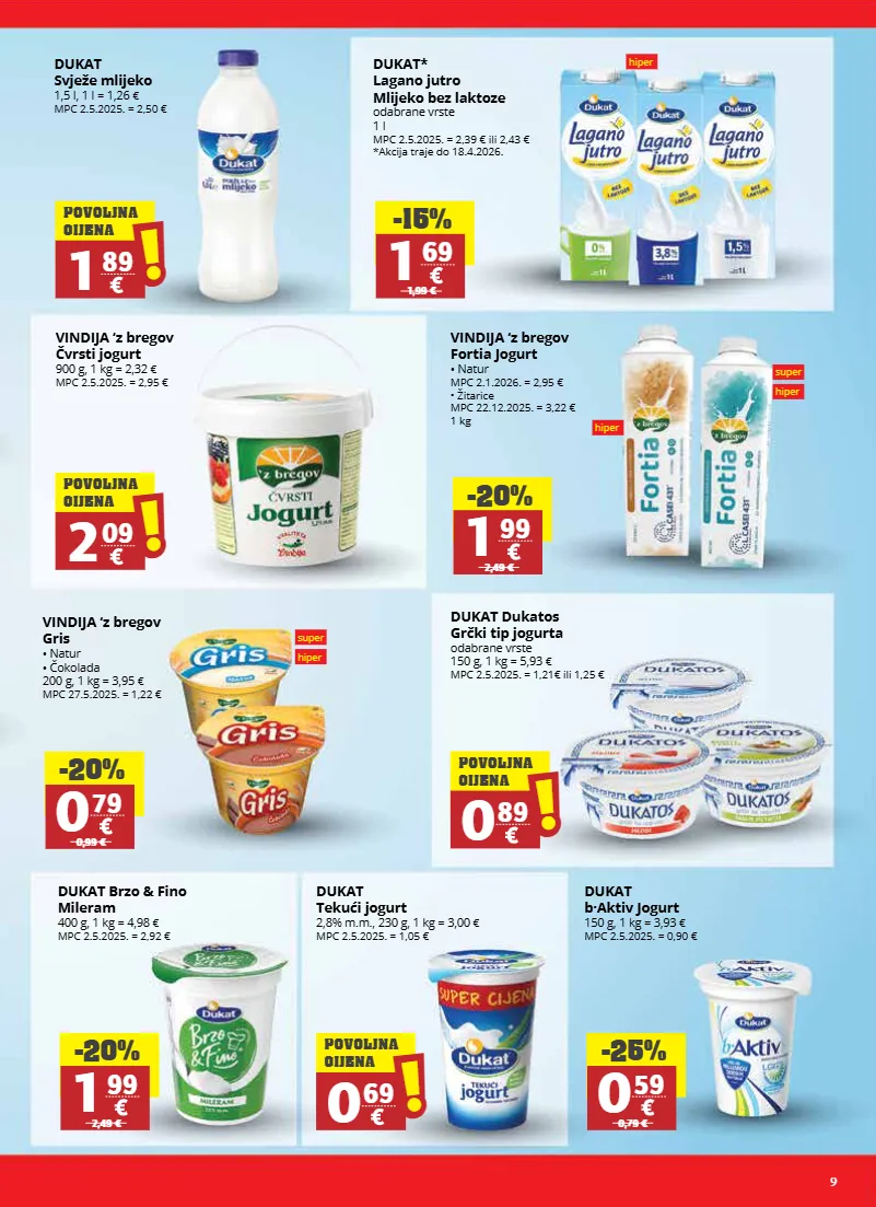 9 super hiper super hiper hiper hiper vindija ‘z bregov gris • natur • čokolada 200 g, 1 kg = 3,95 € mpc 27.5.2025. = 1,22 € -20% 0 79 0,99 € dukat svježe mlijeko 1,5 l, 1 l = 1,26 € mpc 2.5.2025. = 2,50 € vindija ‘z bregov čvrsti jogurt 900 g, 1 kg = 2,32 € mpc 2.5.2025. = 2,95 € dukat brzo & fino mileram 400 g, 1 kg = 4,98 € mpc 2.5.2025. = 2,92 € dukat dukatos grčki tip jogurta odabrane vrste 150 g, 1 kg = 5,93 € mpc 2.5.2025. = 1,21€ ili 1,25 € dukat tekući jogurt 2,8% m.m., 230 g, 1 kg = 3,00 € mpc 2.5.2025. = 1,05 € dukat b·aktiv jogurt 150 g, 1 kg = 3,93 € mpc 2.5.2025. = 0,90 € vindija ‘z bregov fortia jogurt • natur mpc 2.1.2026. = 2,95 € • žitarice mpc 22.12.2025. = 3,22 € 1 kg dukat* lagano jutro mlijeko bez laktoze odabrane vrste 1 l mpc 2.5.2025. = 2,39 € ili 2,43 € *akcija traje do 18.4.2026. -15% 1 69 1,99 € -20% 1 99 2,49 € -20% 1 99 2,49 € -25% 0 59 0,79 € 1 89 ! ! povoljna cijena 0 89 ! ! povoljna cijena 0 69 ! ! povoljna cijena 2 09 ! ! povoljna cijena