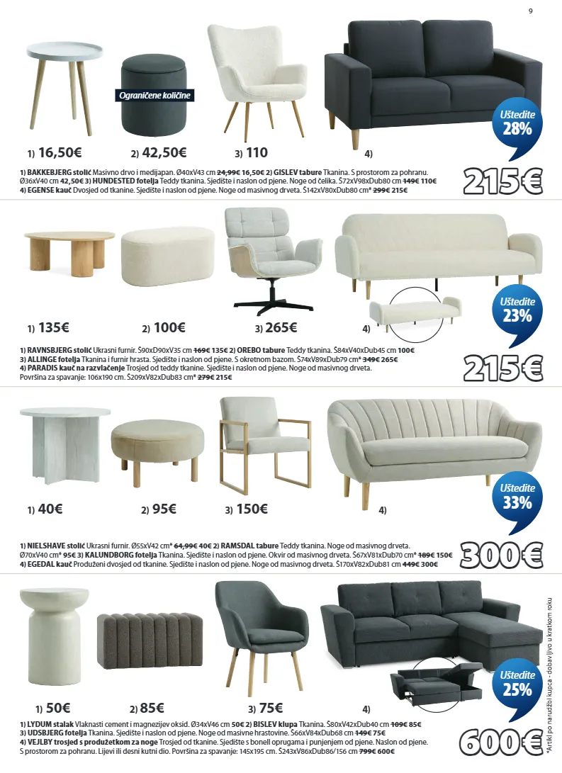 9 1) bakkebjerg stolić masivno drvo i medijapan. ø40xv43 cm 24,99€ 16,50€ 2) gislev tabure tkanina. s prostorom za pohranu. ø36xv40 cm 42,50€ 3) hundested fotelja teddy tkanina. sjedište i naslon od pjene. noge od čelika. š72xv98xdub80 cm 149€ 110€ 4) egense kauč dvosjed od tkanine. sjedište i naslon od pjene. noge od masivnog drveta. š142xv80xdub80 cm* 299€ 215€ 1) 16,50€ 2) 42,50€ 3) 110 4) 215 215 € € uštedite 28% 1) nielshave stolić ukrasni furnir. ø55xv42 cm* 64,99€ 40€ 2) ramsdal tabure teddy tkanina. noge od masivnog drveta. ø70xv40 cm* 95€ 3) kalundborg fotelja tkanina. sjedište i naslon od pjene. okvir od masivnog drveta. š67xv81xdub70 cm* 189€ 150€ 4) egedal kauč produženi dvosjed od tkanine. sjedište i naslon od pjene. noge od masivnog drveta. š170xv82xdub81 cm 449€ 300€ 1) 40€ 2) 95€ 3) 150€ 4) 300 300 € € uštedite 33% 1) ravnsbjerg stolić ukrasni furnir. š90xd90xv35 cm 169€ 135€ 2) orebo tabure teddy tkanina. š84xv40xdub45 cm 100€ 3) allinge fotelja tkanina i furnir hrasta. sjedište i naslon od pjene. s okretnom bazom. š74xv89xdub79 cm* 349€ 265€ 4) paradis kauč na razvlačenje trosjed od teddy tkanine. sjedište i naslon od pjene. noge od masivnog drveta. površina za spavanje: 106x190 cm. š209xv82xdub83 cm* 279€ 215€ 1) 135€ 2) 100€ 4) 215 215 € € uštedite 23% 1) lydum stalak vlaknasti cement i magnezijev oksid. ø34xv46 cm 50€ 2) bislev klupa tkanina. š80xv42xdub40 cm 109€ 85€ 3) udsbjerg fotelja tkanina. sjedište i naslon od pjene. noge od masivne hrastovine. š66xv84xdub68 cm 149€ 75€ 4) vejlby trosjed s produžetkom za noge trosjed od tkanine. sjedište s bonell oprugama i punjenjem od pjene. naslon od pjene. s prostorom za pohranu. lijevi ili desni kutni dio. površina za spavanje: 145x195 cm. š243xv86xdub86/156 cm 799€ 600€ 1) 50€ 2) 85€ 3) 75€ 4) 600 600 € € uštedite 25% *artikl po narudžbi kupca - dobavljivo u kratkom roku ograničene količine 3) 265€ 3640251 3640249 3640222 3690339 3650188 3640291 3650025 3670069 3630049 3690462 3650065 3690442 3650183 3690351 3690380 3630110