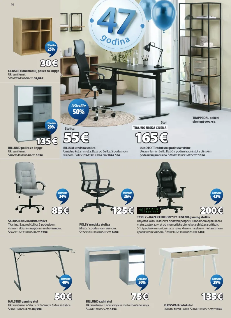 10 lundtoft radni stol podesive visine ukrasni furnir i čelik. bežični podizni radni stol s plinskim podešavanjem visine. š70xd130xv71-117 cm* 165€ 165 165 € € stol trajno niska cijena billum uredska stolica umjetna koža i mreža. baza od čelika. s podesivom visinom. š61xv109-119xdub62 cm 109€ 55€ 55 55 € € stolica uštedite 50% trappedal polični element 99€ 75€ skodsborg uredska stolica tkanina. baza od čelika. s podesivom visinom i kliznim nagibnim mehanizmom. š66xv113-123xdub68 cm 129€ 85 85 € € uštedite 34% folby uredska stolica mreža. s podesivom visinom. š57xv107-116xdub62 cm 169€ 125 125 € € uštedite 26% type z – razer edition™ by legend gaming stolica umjetna koža. jastuci za dodatnu potporu lumbalnom dijelu leđa i vratu. jastuk za vrat od memorijske pjene koja ublažava pritisak. s 1d podesivim naslonima za ruke, kliznim nagibnim mehanizmom i podesivom visinom. š70xv126-136xdub70 cm 349€ 200 200 € € uštedite 43% halsted gaming stol ukrasni furnir i čelik. s držačem za čašu i slušalice. š60xd120xv74 cm 84,99€ 50 50 € € uštedite 40% billund radni stol ukrasni furnir. ladica koja se može izvući do kraja. š54xd120xv75 cm 149€ 75 75 € € uštedite 50% plovsvad radni stol ukrasni furnir i čelik. š50xd110xv77 cm* 189€ 135 135 € € uštedite 29% gedser zidni modul, polica za knjige ukrasni furnir. š55xv55xdub30 cm 39,99€ 30 30 € € uštedite 25% billund polica za knjige ukrasni furnir. š90xv140xdub40 cm 169€ 135 135 € € uštedite 20% 3650209 3601323 3601018 3690247 3670570 3601050 3600634 3681949 3602065 3670583 3681962