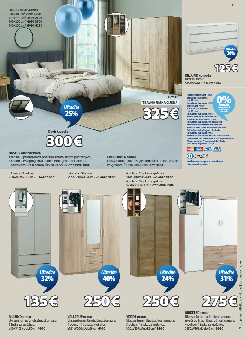 11 haslev okvir kreveta tkanina. s prostorom za pohranu s hidrauličkim podizanjem. za madrace s oprugama i madrace od pjene 140x200 cm. s podnicom. bez madraca. š159xd217xv112 cm* 399€ 300€ haslev okvir kreveta 90x200 cm* 299€ 235€ 120x200 cm* 369€ 285€ 160x200 cm* 469€ 350€ 180x200 cm* 549€ 425€ 300 300 € € okvir kreveta uštedite 25% limfjorden ormar ukrasni furnir. unutrašnjost ormara: 4 police i 2 šipke za vješalice. š180xv200xdub58 cm* 325€ 325 325 € € ormar trajno niska cijena billund ormar ukrasni furnir. unutrašnjost ormara: 1 šipka za vješalice. š80xv193xdub50 cm 199€ s 2 vrata i 2 ladice, š119xv193xdub51 cm 249€ 200€ 135 135 € € uštedite 32% vellerup ormar ukrasni furnir. unutrašnjost ormara: 4 police i 1 šipka za vješalice. š151xv200xdub59 cm 419€ s 4 vrata i 3 ladice, š200xv200xdub59 cm* 499€ 350€ 250 250 € € uštedite 40% vedde ormar ukrasni furnir. unutrašnjost ormara: 5 polica i 1 šipka za vješalice. š90xv197xdub53 cm* 329€ 6 polica i 2 šipke za vješalice. š167xv197xdub53 cm* 499€ 350€ 6 polica i 2 šipke za vješalice. š220xv197xdub61 cm* 699€ 550€ 250 250 € € uštedite 24% birkelse ormar ukrasni furnir. ladice koje se mogu izvući do kraja. unutrašnjost ormara: 4 police i 1 šipka za vješalice. š150xv198xdub60 cm 399€ 275 275 € € uštedite 31% billund komoda ukrasni furnir. š153xv74xdub39 cm 179€ 125 125 € € uštedite 30% 0% kamata mogućnost plaćanja na rate *kod nas možete plaćati navedenim kreditnim karticama plaćajte mastercard i visa karticama rba banke i do 12 rata (min. iznos kupovine 40 €)! mastercard i visa karticama otp banke i do 36 rata (min. iznos kupovine 70 €)! maestro i mastercard karticama zagrebačke banke i do 12 rata (min. iznos kupovine 30 € za maestro karticu i 70 € za mastercard karticu)! maestro, visa i visa premium karticama privredne banke zagreb i do 6 rata (min. iznos kupovine 70 €)! mbplus visa, maestro i mastercard karticama erste banke i do 6 rata (min. iznos kupovine 70 €)! diners karticom erste banke i do 12 rata (min. iznos kupovine 130 €)! *artikl po narudžbi kupca - dobavljivo u kratkom roku 3601287 3670216 3630131 3696672 3601089 3672232 3601409
