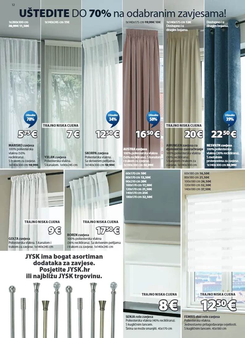 12 amungen zavjesa za djelomično zamračivanje 100% poliesterska vlakna (30% reciklirana). s kanalom i trakom za zavjese. 1x140x300 cm 1x140x175 cm 12€ dostupno i u drugim bojama. dostupno i u drugim bojama. austra zavjesa 100% poliesterska vlakna (50% reciklirana). s kanalom i trakom za zavjese. 1x140x300 cm 32,99€ 1x140x175 cm 19,99€ 10€ 16 16 50 50 € € uštedite 50% uštedite do 70% na odabranim zavjesama! yxlan zavjesa poliesterska vlakna. s kanalom. 1x90x245 cm 1x140x245 cm 11€ marisko zavjesa 100% poliesterska vlakna (50% reciklirana). s trakom za zavjese. 1x140x300 cm 18,99€ 1x280x300 cm 36,99€ 11,50€ 5 5 75 75 € € uštedite 70% skorpa zavjesa poliesterska vlakna. sa skrivenim petljama. 1x140x300 cm 18,99€ 12 12 50 50 € € uštedite 34% nesvatn zavjesa 100% poliesterska vlakna (20% reciklirana). s metalnim prstenovima za zavjese. 1x140x300 cm 36,99€ 22 22 50 50 € € uštedite 39% senja rolo zavjesa poliesterska vlakna (40% reciklirana). s kugličnim lancem. širina se može smanjiti. 45x170 cm 60x170 cm 10€ 80x170 cm 13,50€ 90x210 cm 20€ 100x170 cm 17,50€ 120x170 cm 21,50€ 140x170 cm 25€ 180x170 cm 32,50€ 8 8 € € trajno niska cijena femris duo rolo zavjesa poliesterska vlakna. jednostavno prilagođavanje svjetlosti. s kugličnim lancem. 45x180 cm 60x180 cm 16,50€ 80x180 cm 21,50€ 100x180 cm 26,50€ 120x180 cm 32,50€ 140x180 cm 37,50€ 12 12 50 50 € € trajno niska cijena jysk ima bogat asortiman dodataka za zavjese. posjetite jysk.hr ili najbližu jysk trgovinu. golta zavjesa poliesterska vlakna. s kanalom i trakom za zavjese. 1x140x245 cm 9 9 € € trajno niska cijena boren zavjesa 100% poliesterska vlakna (36% reciklirana). sa skrivenim petljama i trakom za zavjese. 1x140x245 cm 17 17 50 50 € € trajno niska cijena 7 7 € € trajno niska cijena 20 20 € € trajno niska cijena 5080032 5099818 5090374 5080040 5095201 5080017 5530100 5529500 5220300 5095801 5089001
