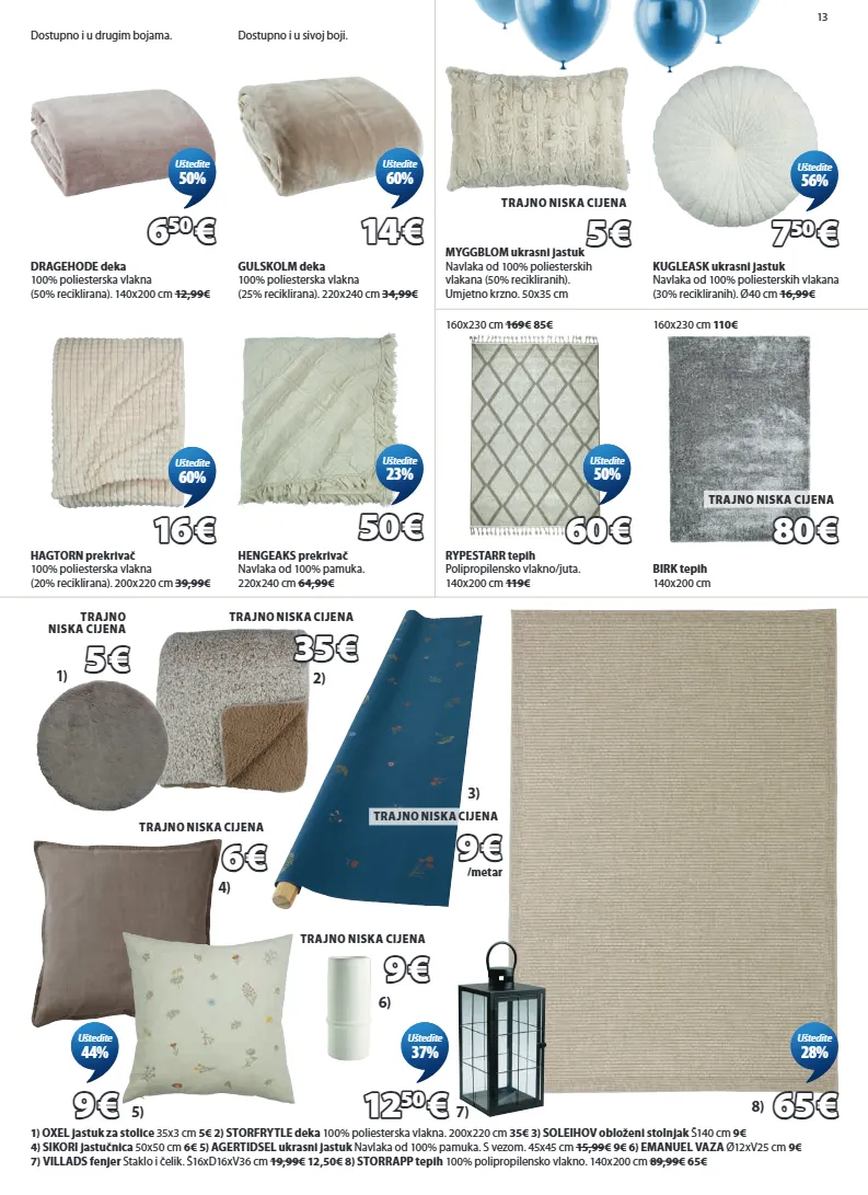 13 1) oxel jastuk za stolice 35x3 cm 5€ 2) storfrytle deka 100% poliesterska vlakna. 200x220 cm 35€ 3) soleihov obloženi stolnjak š140 cm 9€ 4) sikori jastučnica 50x50 cm 6€ 5) agertidsel ukrasni jastuk navlaka od 100% pamuka. s vezom. 45x45 cm 15,99€ 9€ 6) emanuel vaza ø12xv25 cm 9€ 7) villads fenjer staklo i čelik. š16xd16xv36 cm 19,99€ 12,50€ 8) storrapp tepih 100% polipropilensko vlakno. 140x200 cm 89,99€ 65€ 1) 5 5 € € trajno niska cijena 35 35 € € trajno niska cijena 2) 4) 65 65 € € uštedite 28% 5) /metar 9 9 € € trajno niska cijena 6) 7) 9 9 € € trajno niska cijena 8) 12 12 50 50 € € uštedite 37% 6 6 € € trajno niska cijena dragehode deka 100% poliesterska vlakna (50% reciklirana). 140x200 cm 12,99€ dostupno i u drugim bojama. 6 6 50 50 € € uštedite 50% gulskolm deka 100% poliesterska vlakna (25% reciklirana). 220x240 cm 34,99€ dostupno i u sivoj boji. 14 14 € € uštedite 60% hengeaks prekrivač navlaka od 100% pamuka. 220x240 cm 64,99€ 50 50 € € uštedite 23% myggblom ukrasni jastuk navlaka od 100% poliesterskih vlakana (50% recikliranih). umjetno krzno. 50x35 cm 5 5 € € trajno niska cijena kugleask ukrasni jastuk navlaka od 100% poliesterskih vlakana (30% recikliranih). ø40 cm 16,99€ 7 7 50 50 € € uštedite 56% rypestarr tepih polipropilensko vlakno/juta. 140x200 cm 119€ 160x230 cm 169€ 85€ 60 60 € € uštedite 50% birk tepih 140x200 cm 160x230 cm 110€ 80 80 € € trajno niska cijena 9 9 € € uštedite 44% 3) hagtorn prekrivač 100% poliesterska vlakna (20% reciklirana). 200x220 cm 39,99€ 16 16 € € uštedite 60% 6893900 4544044 6517344 6895200 4912840 5703000 4912770 4544419 4541308 4614344 6888444 6884901 6514574 6521642 6856644 4615144