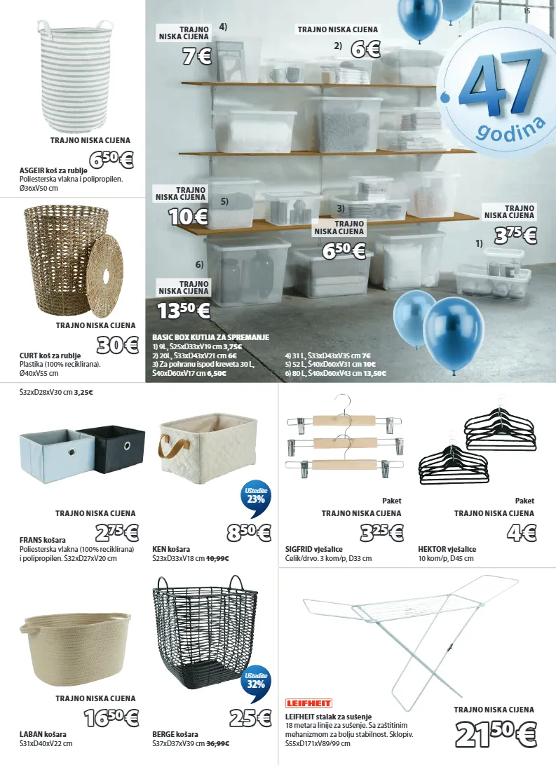 15 basic box kutija za spremanje 1) 9l, š25xd33xv19 cm 3,75€ 2) 20l, š33xd43xv21 cm 6€ 3) za pohranu ispod kreveta 30 l, š40xd60xv17 cm 6,50€ 4) 31 l, š33xd43xv35 cm 7€ 5) 52 l, š40xd60xv31 cm 10€ 6) 80 l, š40xd60xv43 cm 13,50€ 1) 3 3 75 75 € € trajno niska cijena 2) 6 6 € € trajno niska cijena 3) 6 6 50 50 € € trajno niska cijena 4) 7 7 € € trajno niska cijena 5) 10 10 € € trajno niska cijena 6) 13 13 50 50 € € trajno niska cijena frans košara poliesterska vlakna (100% reciklirana) i polipropilen. š32xd27xv20 cm š32xd28xv30 cm 3,25€ ken košara š23xd33xv18 cm 10,99€ 8 8 50 50 € € uštedite 23% laban košara š31xd40xv22 cm 16 16 50 50 € € trajno niska cijena berge košara š37xd37xv39 cm 36,99€ 25 25 € € uštedite 32% sigfrid vješalice čelik/drvo. 3 kom/p, d33 cm 3 3 25 25 € € paket trajno niska cijena hektor vješalice 10 kom/p, d45 cm 4 4 € € paket trajno niska cijena 2 2 75 75 € € trajno niska cijena leifheit stalak za sušenje 18 metara linije za sušenje. sa zaštitinim mehanizmom za bolju stabilnost. sklopiv. š55xd171xv89/99 cm trajno niska cijena 21 21 50 50 € € asgeir koš za rublje poliesterska vlakna i polipropilen. ø36xv50 cm trajno niska cijena 6 6 50 50 € € curt koš za rublje plastika (100% reciklirana). ø40xv55 cm 30 30 € € trajno niska cijena 4922008 4922004 4922002 4922020 4912661 4912662 4912352 4912532 4912636 4912823 4912461 3982900 4912656 4912676 4911004