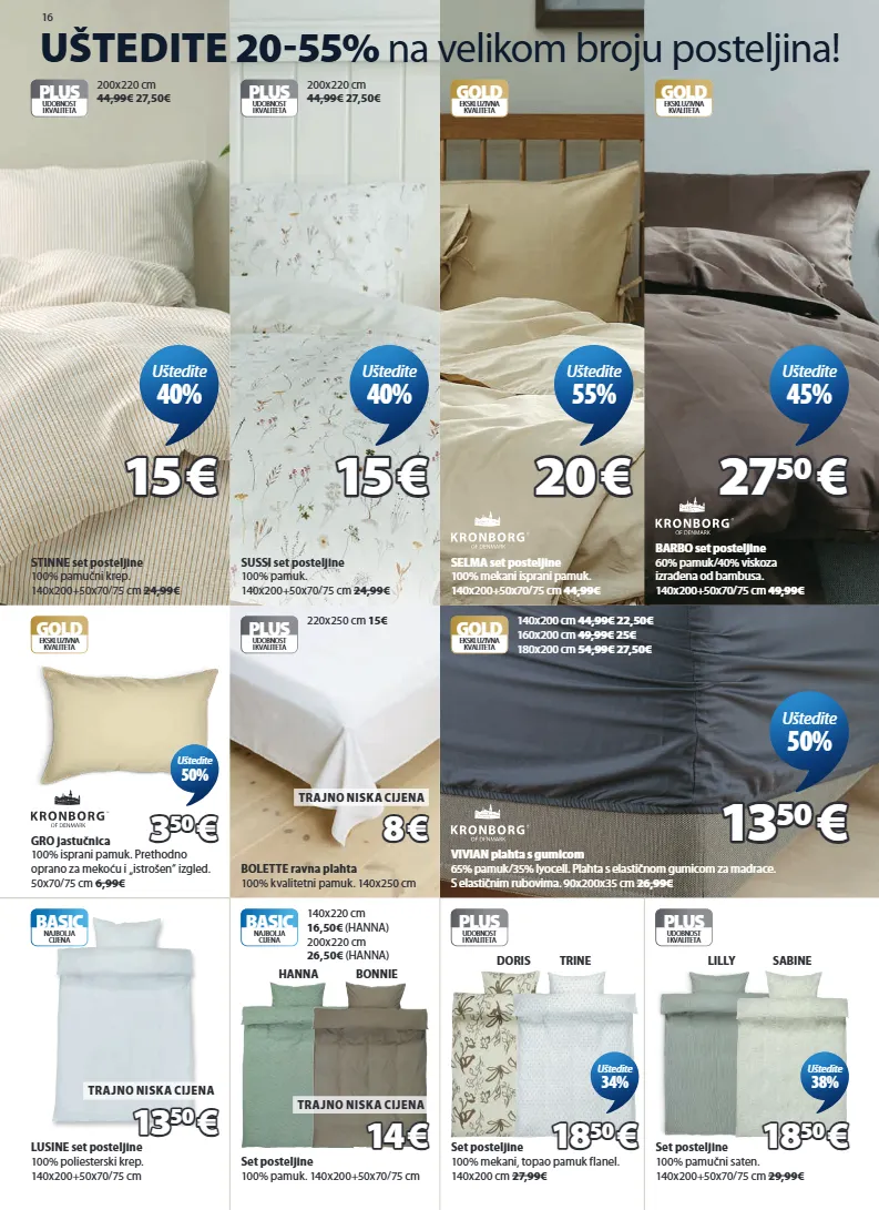 16 plus udobnost i kvaliteta set posteljine 100% pamučni saten. 140x200+50x70/75 cm 29,99€ 18 18 50 50 € € uštedite 38% lilly plus udobnost i kvaliteta set posteljine 100% mekani, topao pamuk flanel. 140x200 cm 27,99€ trine 18 18 50 50 € € uštedite 34% doris bonnie basic najbolja cijena set posteljine 100% pamuk. 140x200+50x70/75 cm hanna 140x220 cm 16,50€ (hanna) 200x220 cm 26,50€ (hanna) 14 14 € € trajno niska cijena sabine bolette ravna plahta 100% kvalitetni pamuk. 140x250 cm 220x250 cm 15€ 8 8 € € trajno niska cijena gold ekskluzivna kvaliteta barbo set posteljine 60% pamuk/40% viskoza izrađena od bambusa. 140x200+50x70/75 cm 49,99€ 27 27 50 50 € € uštedite 45% gold ekskluzivna kvaliteta gro jastučnica 100% isprani pamuk. prethodno oprano za mekoću i „istrošen“ izgled. 50x70/75 cm 6,99€ 3 3 50 50 € € uštedite 50% basic najbolja cijena lusine set posteljine 100% poliesterski krep. 140x200+50x70/75 cm 13 13 50 50 € € trajno niska cijena gold ekskluzivna kvaliteta vivian plahta s gumicom 65% pamuk/35% lyocell. plahta s elastičnom gumicom za madrace. s elastičnim rubovima. 90x200x35 cm 26,99€ 140x200 cm 44,99€ 22,50€ 160x200 cm 49,99€ 25€ 180x200 cm 54,99€ 27,50€ 13 13 50 50 € € uštedite 50% gold ekskluzivna kvaliteta selma set posteljine 100% mekani isprani pamuk. 140x200+50x70/75 cm 44,99€ 20 20 € € uštedite 55% plus udobnost i kvaliteta sussi set posteljine 100% pamuk. 140x200+50x70/75 cm 24,99€ 200x220 cm 44,99€ 27,50€ 15 15 € € uštedite 40% plus udobnost i kvaliteta stinne set posteljine 100% pamučni krep. 140x200+50x70/75 cm 24,99€ 200x220 cm 44,99€ 27,50€ 15 15 € € uštedite 40% uštedite 20-55% na velikom broju posteljina! plus udobnost i kvaliteta 1852680 1394980 7397480 1850980 1829280 1833980 1439001 1811180 1070170 7399080 1634363 1807980 7379680 1845180