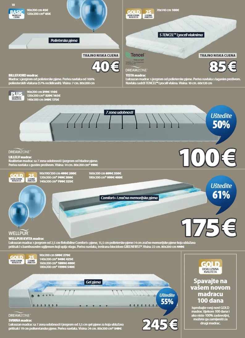 18 spavajte na vašem novom madracu 100 dana isprobajte svoj novi gold madrac tijekom 100 dana i ako niste 100% zadovoljni, možete ga zamijeniti za drugi madrac. gold ekskluzivna kvaliteta comfort+ i zračna memorijska pjena gold 25 godina jamstva ekskluzivna kvaliteta wellpur kvita madrac luksuzan madrac s jezgrom od 2,5 cm fleksibilne comfort+ pjene, 15,5 cm polieterske pjene i 4 cm zračne memorijske pjene koja ublažava pritisak i s bambusovim ugljenom koji upija vlagu. periva navlaka, tretirana biocidom greenfirst®. visina 22 cm. 80x200 cm 449€ 90x190/200 cm 499€ 200€ 120x200 cm* 749€ 300€ 140x200 cm* 799€ 325€ 175 175 € € uštedite 61% gel pjena gold 25 godina jamstva ekskluzivna kvaliteta svinna madrac luksuzan madrac sa 7 zona udobnosti i jezgrom od 3,5 cm gel pjene za koja ublažava pritisak i 19 cm poliuretanske pjene. periva navlaka. visina: 24 cm. 80x200 cm* 549€ 90x200 cm 599€ 270€ 140x200 cm* 949€ 425€ 160x200 cm* 1099€ 490€ 180x200 cm* 1199€ 540€ 245 245 € € uštedite 55% polieterska pjena basic najbolja cijena billefjord madrac madrac s jezgrom od polieterske pjene. periva navlaka od 100% poliesterskih vlakana (57% recikliranih). visina: 7 cm. 80x200 cm 90x200 cm 45€ 120x200 cm* 65€ 40 40 € € trajno niska cijena s tencel™ lyocell vlaknima gold 25 godina jamstva ekskluzivna kvaliteta tista madrac luksuzan madrac s jezgrom od polieterske pjene. periva navlaka s laganim prošivom. navlaka sadrži tencel™ lyocell vlakna. visina: 10 cm. 60x120 cm 70x140 cm 100€ 85 85 € € trajno niska cijena 7 zona udobnosti plus udobnost i kvaliteta lillelv madrac kvalitetan madrac sa 7 zona udobnosti i jezgrom od hladne pjene. periva navlaka s gustim prošivom. visina: 14 cm. 80x200 cm* 199€ 90x200 cm 219€ 110€ 120x200 cm* 329€ 165€ 140x200 cm 349€ 175€ 100 100 € € uštedite 50% 160x200 cm 899€ 350€ 180x200 cm* 999€ 400€ 3379023 3278523 3271023 3375009 3270923