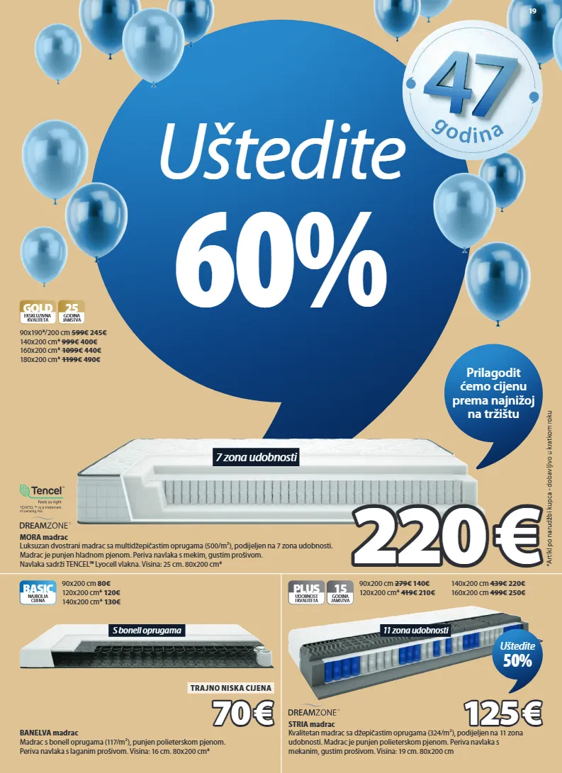 19 *artikl po narudžbi kupca - dobavljivo u kratkom roku 7 zona udobnosti mora madrac luksuzan dvostrani madrac sa multidžepičastim oprugama (500/m²), podijeljen na 7 zona udobnosti. madrac je punjen hladnom pjenom. periva navlaka s mekim, gustim prošivom. navlaka sadrži tencel™ lyocell vlakna. visina: 25 cm. 80x200 cm* gold 25 godina jamstva ekskluzivna kvaliteta 90x190*/200 cm 599€ 245€ 140x200 cm* 999€ 400€ 160x200 cm* 1099€ 440€ 180x200 cm* 1199€ 490€ 220 220 € € s bonell oprugama basic najbolja cijena banelva madrac madrac s bonell oprugama (117/m²), punjen polieterskom pjenom. periva navlaka s laganim prošivom. visina: 16 cm. 80x200 cm* 90x200 cm 80€ 120x200 cm* 120€ 140x200 cm* 130€ 70 70 € € trajno niska cijena 11 zona udobnosti plus udobnost i kvaliteta 15 godina jamstva stria madrac kvalitetan madrac sa džepičastim oprugama (324/m²), podijeljen na 11 zona udobnosti. madrac je punjen polieterskom pjenom. periva navlaka s mekanim, gustim prošivom. visina: 19 cm. 80x200 cm 90x200 cm 279€ 140€ 120x200 cm* 419€ 210€ 125 125 € € uštedite 50% uštedite 60% 140x200 cm 439€ 220€ 160x200 cm 499€ 250€ prilagodit ćemo cijenu prema najnižoj na tržištu 3398223 3269723 3264323