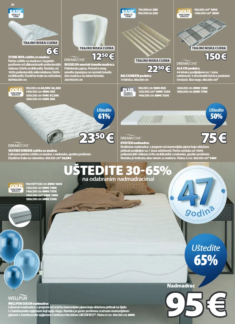 20 gold ekskluzivna kvaliteta ala fix podnica 44 letvice podijeljene na 7 zona udobnosti. 9 dvostrukih letvica podesive čvrstoće. bez nogu. 80x200 cm* 90x200 cm* 165€ 140x200 cm* 265€ 150 150 € € trajno niska cijena basic najbolja cijena store mya zaštita za madrac periva zaštita za madrace s laganim prošivom od silikoniziranih poliesterskih vlakana (100% recikliranih). navlaka od 100% poliesterskih mikrovlakana (100% recikliranih). elastične trake na rubovima. 80/90x200 cm 6 6 € € trajno niska cijena russelva umetak između madraca polieterska pjena. pomoću ovog umetka ispunjava se razmak između dva madraca na istom krevetu. 20x195x10 cm 12 12 50 50 € € trajno niska cijena basic najbolja cijena balfjorden podnica 14 letvica. 80x200 cm 70x200cm 20€ 90x200cm 25€ 22 22 50 50 € € trajno niska cijena gold ekskluzivna kvaliteta wellpur gulen nadmadrac luksuzan nadmadrac s jezgrom od zračne memorijske pjene koja ublažava pritisak na tijelo i s bambusovim ugljenom koji upija vlagu. navlaka je gusto prošivena zračnom memorijskom pjenom s bambusovim ugljenom i tretirana biocidom greenfirst®. visina 8 cm. 80x200 cm 269€ uštedite 30-65% na odabranim nadmadracima! 90x190*/200 cm 299€ 105€ 120x200 cm 399€ 140€ 140x200 cm 499€ 175€ 160x200 cm* 549€ 190€ 180x200 cm 599€ 210€ 95 95 € € nadmadrac uštedite 65% gold ekskluzivna kvaliteta vestrefjorden zaštita za madrac luksuzna periva zaštita za madrac s mekanim, gustim prošivom. elastične trake na rubovima. 80x200 cm* 59,99€ 90x200 cm 64,99€ 26,50€ 140x200 cm 109€ 45€ 160x200 cm 119€ 47,50€ 180x200 cm 129€ 50€ 23 23 50 50 € € uštedite 61% plus udobnost i kvaliteta kvisten nadmadrac kvalitetan nadmadrac s jezgrom od memorijske pjene koja ublažava pritisak podijeljen na 7 zona udobnosti. periva navlaka od 100% poliesterskih vlakana (54% recikliranih) s mekanim, gustim prošivom. navlaka je tretirana aloe verom za mekoću. visina: 6 cm. 80x200 cm* 149€ 90x200 cm 169€ 85€ 120x200 cm* 249€ 125€ 140x200 cm 269€ 135€ 75 75 € € uštedite 50% 160x200 cm 299€ 150€ 180x200 cm 339€ 170€ 3554423 3448027 3541303 3553823 3439723 3443523 3444423