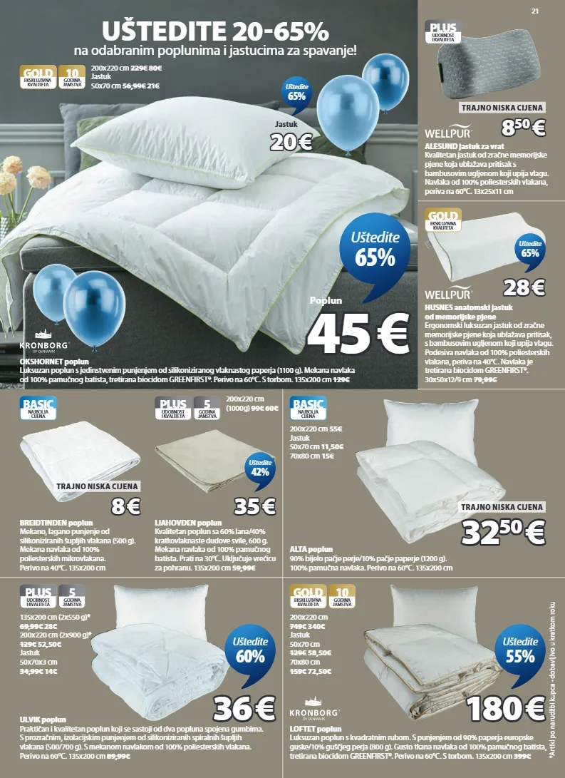 21 uštedite 20-65% na odabranim poplunima i jastucima za spavanje! *artikl po narudžbi kupca - dobavljivo u kratkom roku plus udobnost i kvaliteta alesund jastuk za vrat kvalitetan jastuk od zračne memorijske pjene koja ublažava pritisak s bambusovim ugljenom koji upija vlagu. navlaka od 100% poliesterskih vlakana, periva na 60°c. 13x25x11 cm 8 8 50 50 € € trajno niska cijena gold ekskluzivna kvaliteta husnes anatomski jastuk od memorijske pjene ergonomski luksuzan jastuk od zračne memorijske pjene koja ublažava pritisak, s bambusovim ugljenom koji upija vlagu. podesiva navlaka od 100% poliesterskih vlakana, periva na 40°c. navlaka je tretirana biocidom greenfirst®. 30x50x12/9 cm 79,99€ 28 28 € € uštedite 65% plus udobnost i kvaliteta 5 godina jamstva ulvik poplun praktičan i kvalitetan poplun koji se sastoji od dva popluna spojena gumbima. s prozračnim, izolacijskim punjenjem od silikoniziranih spiralnih šupljih vlakana (500/700 g). s mekanom navlakom od 100% poliesterskih vlakana. perivo na 60°c. 135x200 cm 89,99€ 135x200 cm (2x550 g)* 69,99€ 28€ 200x220 cm (2x900 g)* 129€ 52,50€ jastuk 50x70x3 cm 34,99€ 14€ 36 36 € € uštedite 60% gold 10 godina jamstva ekskluzivna kvaliteta loftet poplun luksuzan poplun s kvadratnim rubom. s punjenjem od 90% paperja europske guske/10% guščjeg perja (800 g). gusto tkana navlaka od 100% pamučnog batista, tretirana biocidom greenfirst®. perivo na 60°c. s torbom. 135x200 cm 399€ 200x220 cm 749€ 340€ jastuk 50x70 cm 129€ 58,50€ 70x80 cm 159€ 72,50€ 180 180 € € uštedite 55% basic najbolja cijena alta poplun 90% bijelo pačje perje/10% pačje paperje (1200 g). 100% pamučna navlaka. perivo na 60°c. 135x200 cm 200x220 cm 55€ jastuk 50x70 cm 11,50€ 70x80 cm 15€ 32 32 50 50 € € trajno niska cijena plus udobnost i kvaliteta 5 godina jamstva liahovden poplun kvalitetan poplun sa 60% lana/40% kratkovlaknaste dudove svile, 600 g. mekana navlaka od 100% pamučnog batista. prati na 30°c. uključuje vrećicu za pohranu. 135x200 cm 59,99€ 200x220 cm (1000g) 99€ 60€ uštedite 42% 35 35 € € basic najbolja cijena breidtinden poplun mekano, lagano punjenje od silikoniziranih šupljih vlakana (500 g). mekana navlaka od 100% poliesterskih mikrovlakana. perivo na 40°c. 135x200 cm 8 8 € € trajno niska cijena gold 10 godina jamstva ekskluzivna kvaliteta okshornet poplun luksuzan poplun s jedinstvenim punjenjem od silikoniziranog vlaknastog paperja (1100 g). mekana navlaka od 100% pamučnog batista, tretirana biocidom greenfirst®. perivo na 60°c. s torbom. 135x200 cm 129€ 200x220 cm 229€ 80€ jastuk 50x70 cm 56,99€ 21€ 45 45 € € poplun uštedite 65% 20 20 € € jastuk uštedite 65% 4239500 4240300 4226004 4050850 4324804 4026050 4059150 4333104 4156850 4045950 4049550 4249504