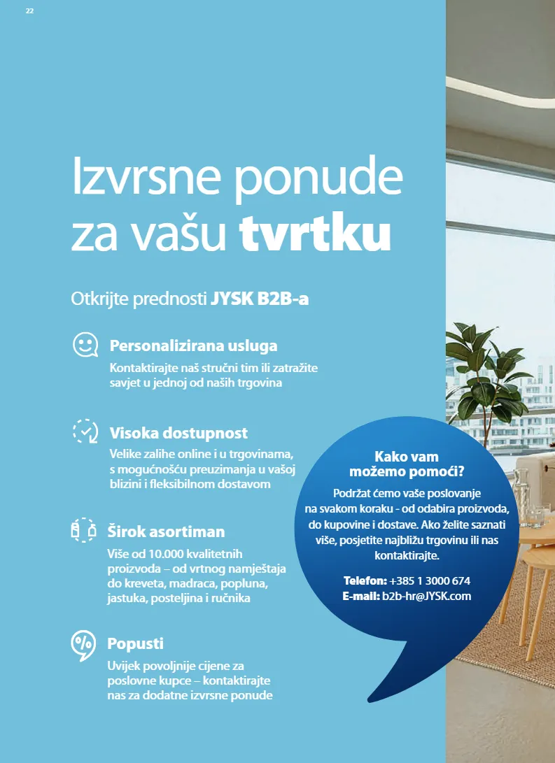 22 izvrsne ponude za vašu tvrtku otkrijte prednosti jysk b2b-a kontaktirajte naš stručni tim ili zatražite savjet u jednoj od naših trgovina personalizirana usluga uvijek povoljnije cijene za poslovne kupce – kontaktirajte nas za dodatne izvrsne ponude popusti širok asortiman više od 10.000 kvalitetnih proizvoda – od vrtnog namještaja do kreveta, madraca, popluna, jastuka, posteljina i ručnika visoka dostupnost velike zalihe online i u trgovinama, s mogućnošću preuzimanja u vašoj blizini i fleksibilnom dostavom kako vam možemo pomoći? podržat ćemo vaše poslovanje na svakom koraku - od odabira proizvoda, do kupovine i dostave. ako želite saznati više, posjetite najbližu trgovinu ili nas kontaktirajte. telefon: +385 1 3000 674 e-mail: b2b-hr@jysk.com