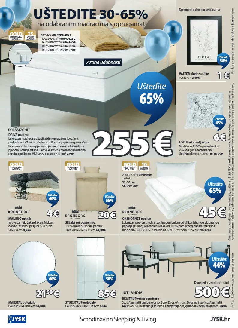 scandinavian sleeping & living jysk.hr jhr w15_2026 www.spring-production.com uštedite 30-65% na odabranim madracima s oprugama! driva madrac luksuzan madrac sa džepičastim oprugama (505/m²), podijeljen na 7 zona udobnosti. madrac je punjen prozračnim lateksom i hladnom pjenom s jedne strane i polieterskom pjenom s druge strane. periva elastična navlaka s mekanim, gustim prošivom. visina: 27 cm. 80x200 cm* 729€ gold 25 godina jamstva ekskluzivna kvaliteta 90x200 cm 799€ 285€ 120x200 cm* 1199€ 425€ 140x200 cm* 1299€ 465€ 160x200 cm* 1459€ 510€ 180x200 cm* 1599€ 570€ 255 255 € € uštedite 65% gold 10 godina jamstva ekskluzivna kvaliteta okshornet poplun luksuzan poplun s jedinstvenim punjenjem od silikoniziranog vlaknastog paperja (1100 g). mekana navlaka od 100% pamučnog batista, tretirana biocidom greenfirst®. perivo na 60°c. s torbom. 135x200 cm 129€ 200x220 cm 229€ 80€ jastuk 50x70 cm 56,99€ 20€ 45 45 € € uštedite 65% studstrup ogledalo čelik. š80xv180xdub3 cm 169€ 85 85 € € uštedite 50% marstal ogledalo čelik. ø50xdub4 cm 54,99€ 21 21 50 50 € € uštedite 60% valter okvir za slike 10x15 cm 2,19€ dostupno u drugim veličinama 1 1 € € uštedite 54% lotus ukrasni jastuk navlaka od 100% poliesterskih vlakana (20% recikliranih). umjetno krzno. 50x50 cm 16,99€ 6 6 € € uštedite 65% gold ekskluzivna kvaliteta malung ručnik 100% pamuk, žakard-tkan. mekan, debeo i visokoupijajući. 500 g/m². 50x100 cm 9,99€ 4 4 € € uštedite 60% gold ekskluzivna kvaliteta selma set posteljine 100% mekani isprani pamuk. 140x200+50x70/75 cm 44,99€ 20 20 € € uštedite 55% sve cijene u katalogu su maloprodajne, izražene u eur i pdv je uključen u cijenu. ponuda vrijedi u vremenskom razdoblju navedenom na naslovnici, odnosno do isteka zaliha. ne preuzimamo odgovornost za moguće tiskarske pogreške i razlike u boji. *artikl po narudžbi kupca - dobavljivo u kratkom roku 7 zona udobnosti bejstrup vrtna garnitura stol: aluminij i umjetno drvo. š60x d105xv41 cm. dvosjed i stolice: aluminij i tekstilen. s luskuznim jastucima s dugotrajnom, grubo trajnom navlakom. 899€ 500 500 € € dvosjed + 2 stolice + stol uštedite 44% 3388723 4049550 4249504 3600475 3690378 4912913 6888801 2347874 1807980 3726058
