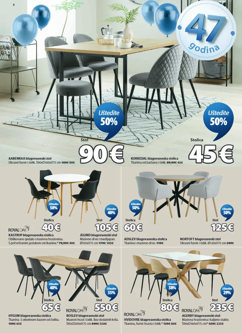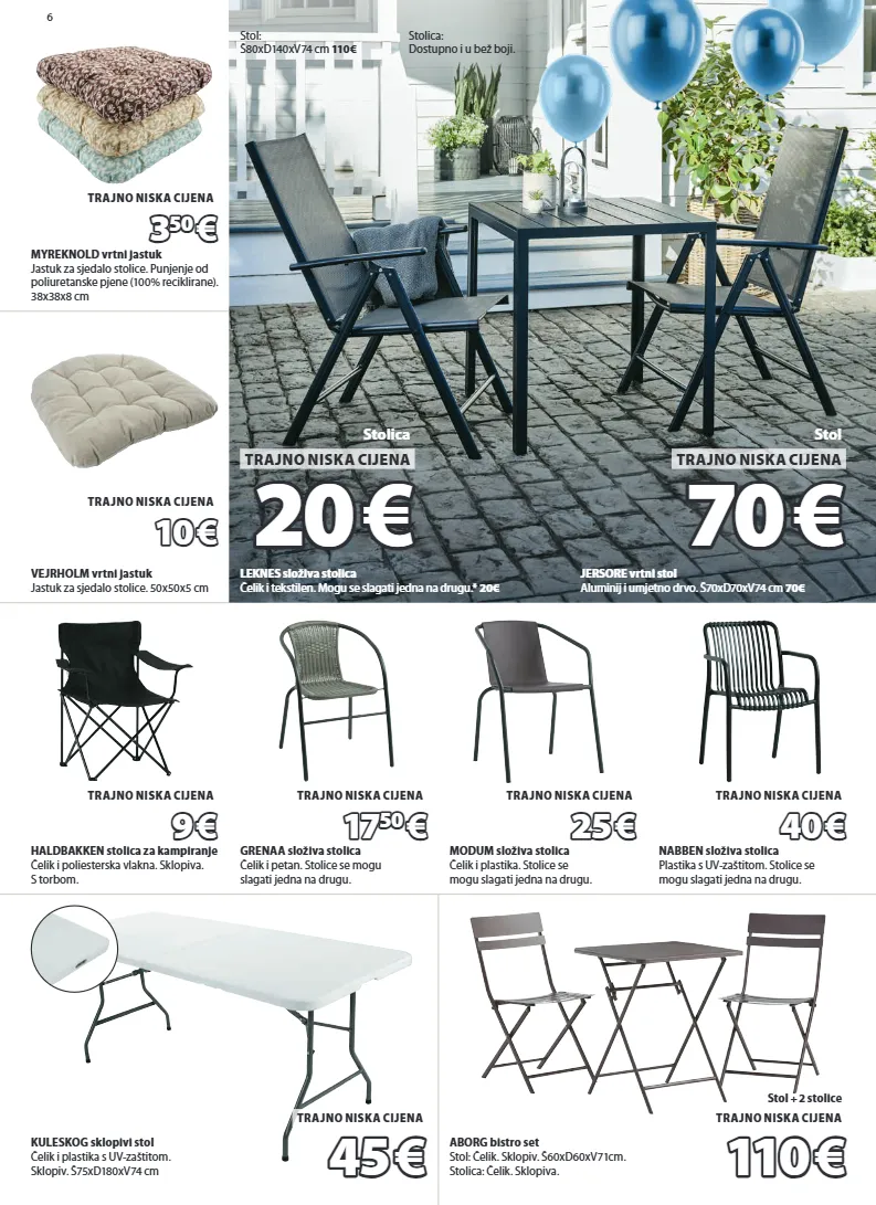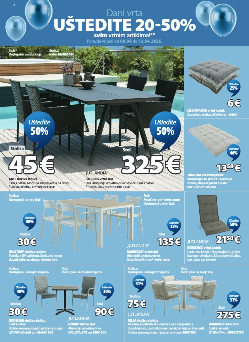 2 dani vrta uštedite 20-50% svim vrtnim artiklima!** ponuda vrijedi od 08.04 do 12.04.2026. fausing vrtni stol stol: aluminij i umjetno drvo. stolice: čelik i petan. š100xd220xv74 cm* 649€ 325€ stol: dostupno i u natur boji. 325 325 € € stol uštedite 50% aidt složiva stolica čelik i petan. mogu se slagati jedna na drugu. š58xv87xdub62 cm* 89,99€ 45€ stolica: natur 89,99€ 45€ 45 45 € € stolica uštedite 50% marielyst vrtni stol aluminij i umjetno drvo. š90xd150xv74 cm* 199€ 135€ stol: š90xd205 cm* 299€ 200€ dostupno i u sivoj boji. 135 135 € € stol uštedite 32% ingstrup složiva stolica plastika s uv-zaštitom. stolice se mogu slagati jedna na drugu. 49,99€ 30€ stolica: dostupno i u crnoj boji. 30 30 € € stolica uštedite 40% hobro bistro stol aluminij i umjetno drvo. š70xd70xv73 cm 129€ 90€ stol: dostupno i u drugim bojama. 90 90 € € stol uštedite 30% gudhjem složiva stolica čelik i petan. stolice se mogu slagati jedna na drugu. š57xv94xdub63 cm 49,99€ 30€ stolica: dostupno i u drugim bojama. 30 30 € € stolica uštedite 40% vamdrup vrtni stol čelik i cement. ø120xv74 cm 399€ 275€ stol: dostupno i u sivoj* boji. 275 275 € € stol uštedite 31% gilja složiva stolica aluminij i poliesterska vlakna. luksuzni jastuci s dugotrajnom, gusto tkanom navlakom koja se brzo suši. stolice se mogu slagati jedna na drugu. 109€ 75€ stolica: dostupno i u drugim* bojama. 75 75 € € stolica uštedite 31% lillomarka vrtni jastuk za sjedalo stolica. 47x47x4 cm 7,99€ 6 6 € € uštedite 25% tanadalen vrtni jastuk višenamjenski jastuci. za lounge stolice, klupe ili piknik i plažu. 60x100x5 cm 24,99€ 13 13 50 50 € € uštedite 46% rebsenge vrtni jastuk luskuzan jastuk s dugotrajnom, grubo tkanom navlakom. za podesive stolice. 50x120x8 cm 54,99€ 21 21 50 50 € € uštedite 50% 3725001 3700434 3726098 3725087 3726054 3700533 3725170 3726083 3726116 3726119 6400012