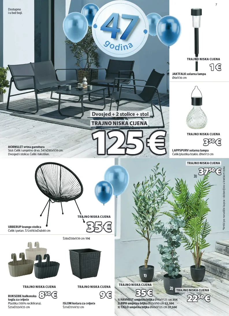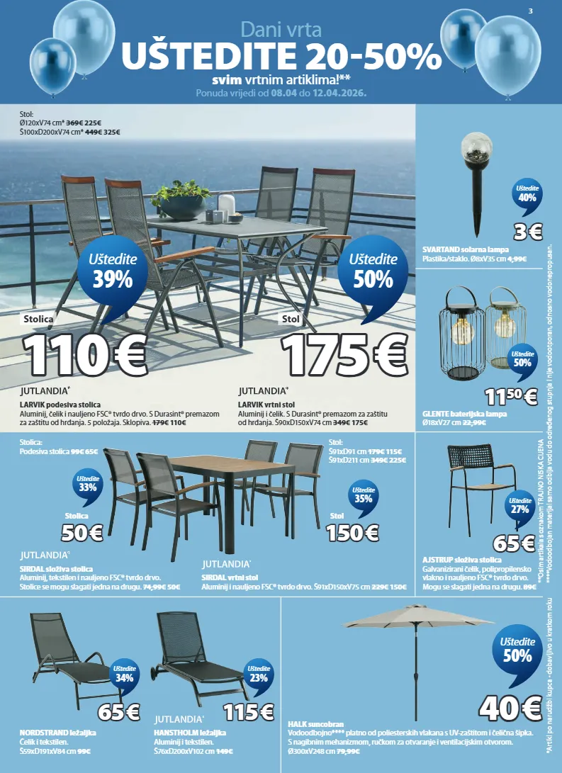 3 dani vrta uštedite 20-50% svim vrtnim artiklima!** ponuda vrijedi od 08.04 do 12.04.2026. larvik vrtni stol aluminij i čelik. s durasint® premazom za zaštitu od hrđanja. š90xd150xv74 cm 349€ 175€ stol: ø120xv74 cm* 369€ 225€ š100xd200xv74 cm* 449€ 325€ 175 175 € € stol uštedite 50% larvik podesiva stolica aluminij, čelik i nauljeno fsc® tvrdo drvo. s durasint® premazom za zaštitu od hrđanja. 5 položaja. sklopiva. 179€ 110€ 110 110 € € stolica uštedite 39% sirdal vrtni stol aluminij i nauljeno fsc® tvrdo drvo. š91xd150xv75 cm 229€ 150€ stol: š91xd91 cm 179€ 115€ š91xd211 cm 349€ 225€ 150 150 € € stol uštedite 35% sirdal složiva stolica aluminij, tekstilen i nauljeno fsc® tvrdo drvo. stolice se mogu slagati jedna na drugu. 74,99€ 50€ stolica: podesiva stolica 99€ 65€ 50 50 € € stolica uštedite 33% halk suncobran vodoodbojno**** platno od poliesterskih vlakana s uv-zaštitom i čelična šipka. s nagibnim mehanizmom, ručkom za otvaranje i ventilacijskim otvorom. ø300xv248 cm 79,99€ 40 40 € € uštedite 50% nordstrand ležaljka čelik i tekstilen. š59xd191xv84 cm 99€ 65 65 € € uštedite 34% hanstholm ležaljka aluminij i tekstilen. š76xd200xv102 cm 149€ 115 115 € € uštedite 23% ajstrup složiva stolica galvanizirani čelik, polipropilensko vlakno i nauljeno fsc® tvrdo drvo. mogu se slagati jedna na drugu. 89€ 65 65 € € uštedite 27% svartand solarna lampa plastika/staklo. ø8xv35 cm 4,99€ 3 3 € € uštedite 40% glente baterijska lampa ø18xv27 cm 22,99€ 11 11 50 50 € € uštedite 50% *artikl po narudžbi kupca - dobavljivo u kratkom roku ****vodoodbojan materijal samo odbija vodu do određenog stupnja i nije vodootporan, odnosno vodonepropusan. **osim artikala s oznakom trajno niska cijena 3759800 3759801 3726137 3726146 3726032 3771500 3725013 3725177 6425011 6425017
