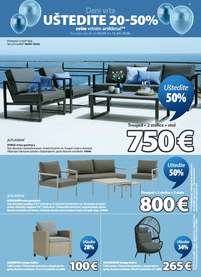 5 dani vrta uštedite 20-50% svim vrtnim artiklima!** ponuda vrijedi od 08.04 do 12.04.2026. vonge vrtna garnitura stol: aluminij i sintetički kamen. š64xd130xv39 cm. trosjed i stolica: aluminij. uključuje i luksuzne jastuke s dugotrajnom, gusto tkanom navlakom. 1499€ dostupno i u bež* boji. set za 6 osoba* 1699€ 1000€ 750 750 € € trosjed + 2 stolice + stol uštedite 50% agermose lounge stolica čelik i petan. s luksuznim jastucima s dugotrajnom, grubo tkanom navlakom. š72×v73×dub68 cm 139€ 100 100 € € uštedite 28% halvrebene lounge stolica čelik i petan. s luksuznim jastucima s dugotrajnom, grubo tkanom navlakom. š85xv143xdub88 cm* 399€ 265 265 € € uštedite 34% *artikl po narudžbi kupca - dobavljivo u kratkom roku **osim artikala s oznakom trajno niska cijena ****vodoodbojan materijal samo odbija vodu do određenog stupnja i nije vodootporan, odnosno vodonepropusan. oddesund vrtna garnitura stol: aluminij i nauljeno fsc® tvrdo drvo. š72/62xd72/62xv39/32 cm. produženi dvosjed i stolice: aluminij i nauljeno fsc® tvrdo drvo. s luksuznim jastucima s dugotrajanom grubo tkanom navlakom od olefina. olefinska tkanina ima postojanu boju i ne upija vlagu. 1599€ 800 800 € € dvosjed + 2 stolice + 2 stola uštedite 50% 3726001 3700519 3725133 3726015