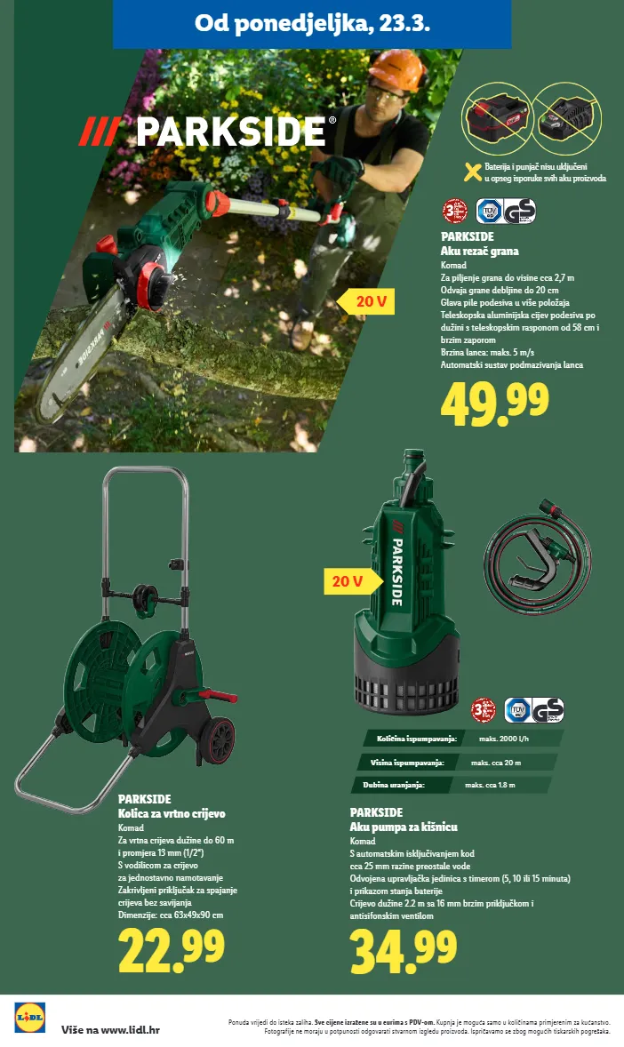 ponuda vrijedi do isteka zaliha. sve cijene izražene su u eurima s pdv-om. kupnja je moguća samo u količinama primjerenim za kućanstvo. fotografije ne moraju u potpunosti odgovarati stvarnom izgledu proizvoda. ispričavamo se zbog mogućih tiskarskih pogrešaka. više na www.lidl.hr od ponedjeljka, 23.3. 34.99 parkside aku pumpa za kišnicu komad s automatskim isključivanjem kod cca 25 mm razine preostale vode odvojena upravljačka jedinica s timerom (5, 10 ili 15 minuta) i prikazom stanja baterije crijevo dužine 2.2 m sa 16 mm brzim priključkom i antisifonskim ventilom 49.99 parkside aku rezač grana komad za piljenje grana do visine cca 2,7 m odvaja grane debljine do 20 cm glava pile podesiva u više položaja teleskopska aluminijska cijev podesiva po dužini s teleskopskim rasponom od 58 cm i brzim zaporom brzina lanca: maks. 5 m/s automatski sustav podmazivanja lanca 20 v baterija i punjač nisu uključeni u opseg isporuke svih aku proizvoda količina ispumpavanja: maks. 2000 l/h visina ispumpavanja: maks. cca 20 m dubina uranjanja: maks. cca 1.8 m 20 v 22.99 parkside kolica za vrtno crijevo komad za vrtna crijeva dužine do 60 m i promjera 13 mm (1/2“) s vodilicom za crijevo za jednostavno namotavanje zakrivljeni priključak za spajanje crijeva bez savijanja dimenzije: cca 63x49x90 cm