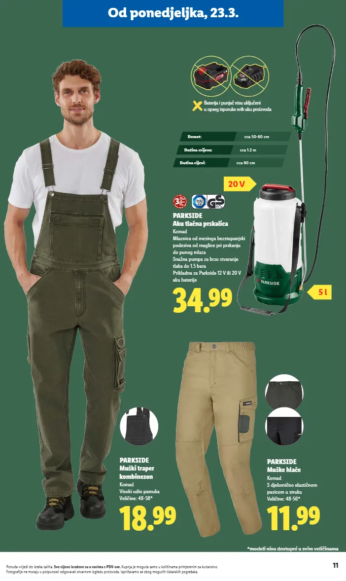 11 ponuda vrijedi do isteka zaliha. sve cijene izražene su u eurima s pdv-om. kupnja je moguća samo u količinama primjerenim za kućanstvo. fotografije ne moraju u potpunosti odgovarati stvarnom izgledu proizvoda. ispričavamo se zbog mogućih tiskarskih pogrešaka. 34.99 parkside aku tlačna prskalica komad mlaznica od mesinga bezstupanjski podesiva od maglice pri prskanju do punog mlaza snažna pumpa za brzo stvaranje tlaka do 1.5 bara prikladna za parkside 12 v ili 20 v aku baterije *modeli nisu dostupni u svim veličinama 11.99 parkside muške hlače komad s djelomično elastičnom pasicom u struku veličine: 48-56* 18.99 parkside muški traper kombinezon komad visoki udio pamuka veličine: 48-58* 20 v 5 l baterija i punjač nisu uključeni u opseg isporuke svih aku proizvoda od ponedjeljka, 23.3. domet: cca 50-60 cm dužina crijeva: cca 1.2 m dužina cijevi: cca 60 cm