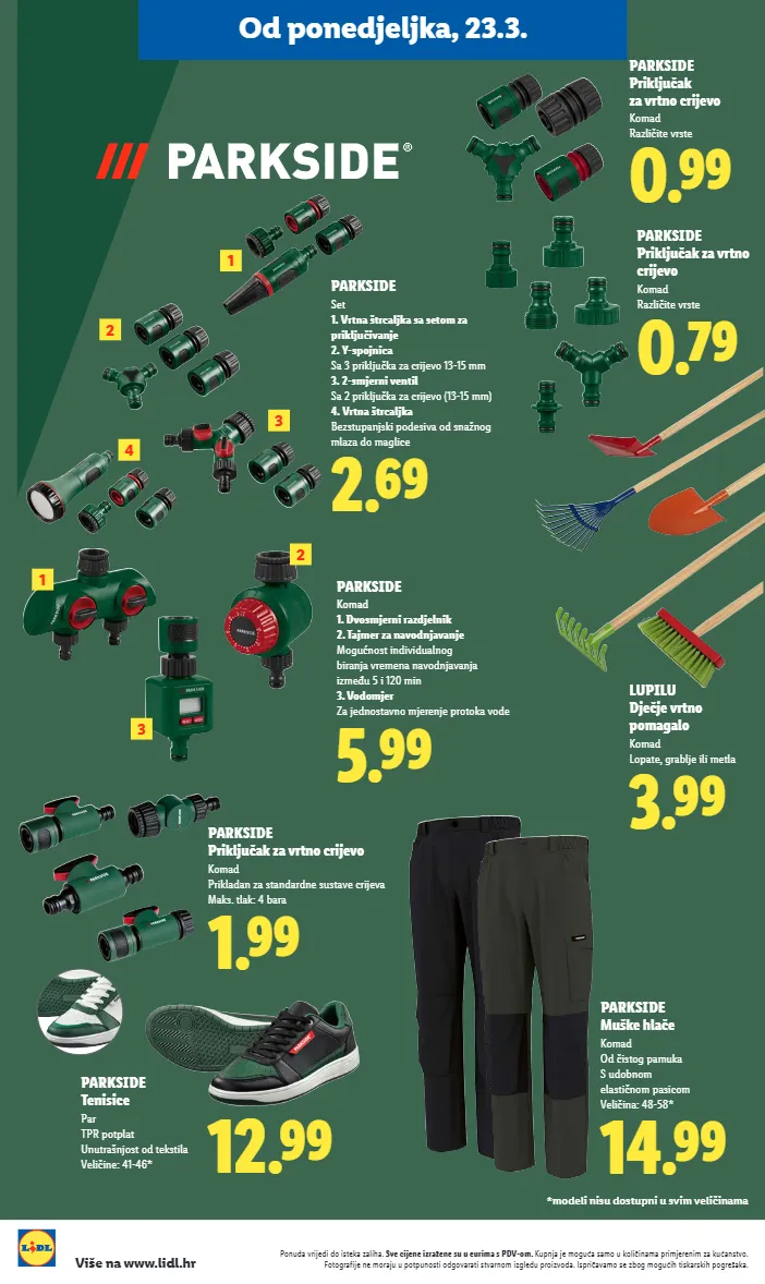 ponuda vrijedi do isteka zaliha. sve cijene izražene su u eurima s pdv-om. kupnja je moguća samo u količinama primjerenim za kućanstvo. fotografije ne moraju u potpunosti odgovarati stvarnom izgledu proizvoda. ispričavamo se zbog mogućih tiskarskih pogrešaka. više na www.lidl.hr 0.79 parkside priključak za vrtno crijevo komad različite vrste 1.99 parkside priključak za vrtno crijevo komad prikladan za standardne sustave crijeva maks. tlak: 4 bara 5.99 parkside komad 1. dvosmjerni razdjelnik 2. tajmer za navodnjavanje mogućnost individualnog biranja vremena navodnjavanja između 5 i 120 min 3. vodomjer za jednostavno mjerenje protoka vode 1 3 2 0.99 parkside priključak za vrtno crijevo komad različite vrste 3 2.69 parkside set 1. vrtna štrcaljka sa setom za priključivanje 2. y-spojnica sa 3 priključka za crijevo 13-15 mm 3. 2-smjerni ventil sa 2 priključka za crijevo (13-15 mm) 4. vrtna štrcaljka bezstupanjski podesiva od snažnog mlaza do maglice 1 2 4 3.99 lupilu dječje vrtno pomagalo komad lopate, grablje ili metla od ponedjeljka, 23.3. 14.99 parkside muške hlače komad od čistog pamuka s udobnom elastičnom pasicom veličina: 48-58* *modeli nisu dostupni u svim veličinama 12.99 parkside tenisice par tpr potplat unutrašnjost od tekstila veličine: 41-46*