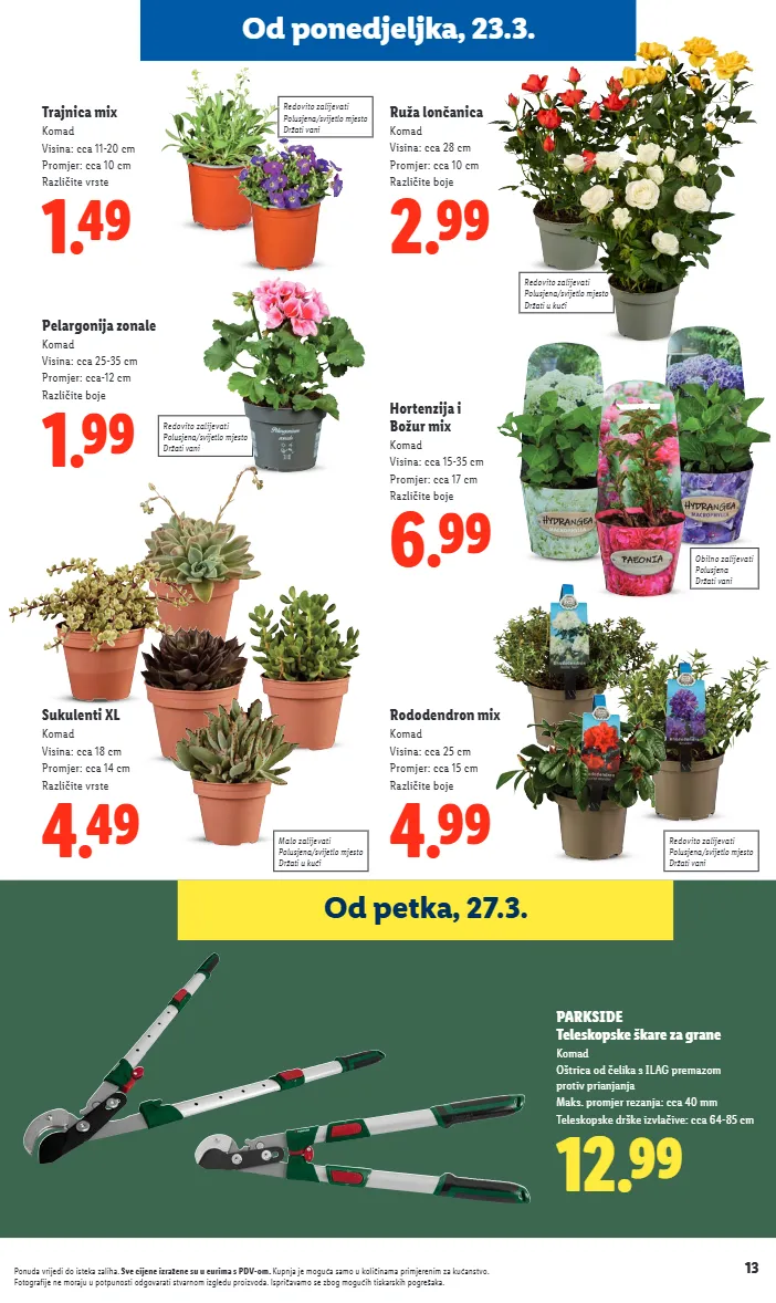 13 ponuda vrijedi do isteka zaliha. sve cijene izražene su u eurima s pdv-om. kupnja je moguća samo u količinama primjerenim za kućanstvo. fotografije ne moraju u potpunosti odgovarati stvarnom izgledu proizvoda. ispričavamo se zbog mogućih tiskarskih pogrešaka. od ponedjeljka, 23.3. od petka, 27.3. 12.99 parkside teleskopske škare za grane komad oštrica od čelika s ilag premazom protiv prianjanja maks. promjer rezanja: cca 40 mm teleskopske drške izvlačive: cca 64-85 cm redovito zalijevati polusjena/svijetlo mjesto držati vani redovito zalijevati polusjena/svijetlo mjesto držati vani trajnica mix komad visina: cca 11-20 cm promjer: cca 10 cm različite vrste 1.49 pelargonija zonale komad visina: cca 25-35 cm promjer: cca-12 cm različite boje 1.99 redovito zalijevati polusjena/svijetlo mjesto držati u kući malo zalijevati polusjena/svijetlo mjesto držati u kući redovito zalijevati polusjena/svijetlo mjesto držati vani 2.99 ruža lončanica komad visina: cca 28 cm promjer: cca 10 cm različite boje 4.49 sukulenti xl komad visina: cca 18 cm promjer: cca 14 cm različite vrste 4.99 rododendron mix komad visina: cca 25 cm promjer: cca 15 cm različite boje obilno zalijevati polusjena držati vani 6.99 hortenzija i božur mix komad visina: cca 15-35 cm promjer: cca 17 cm različite boje