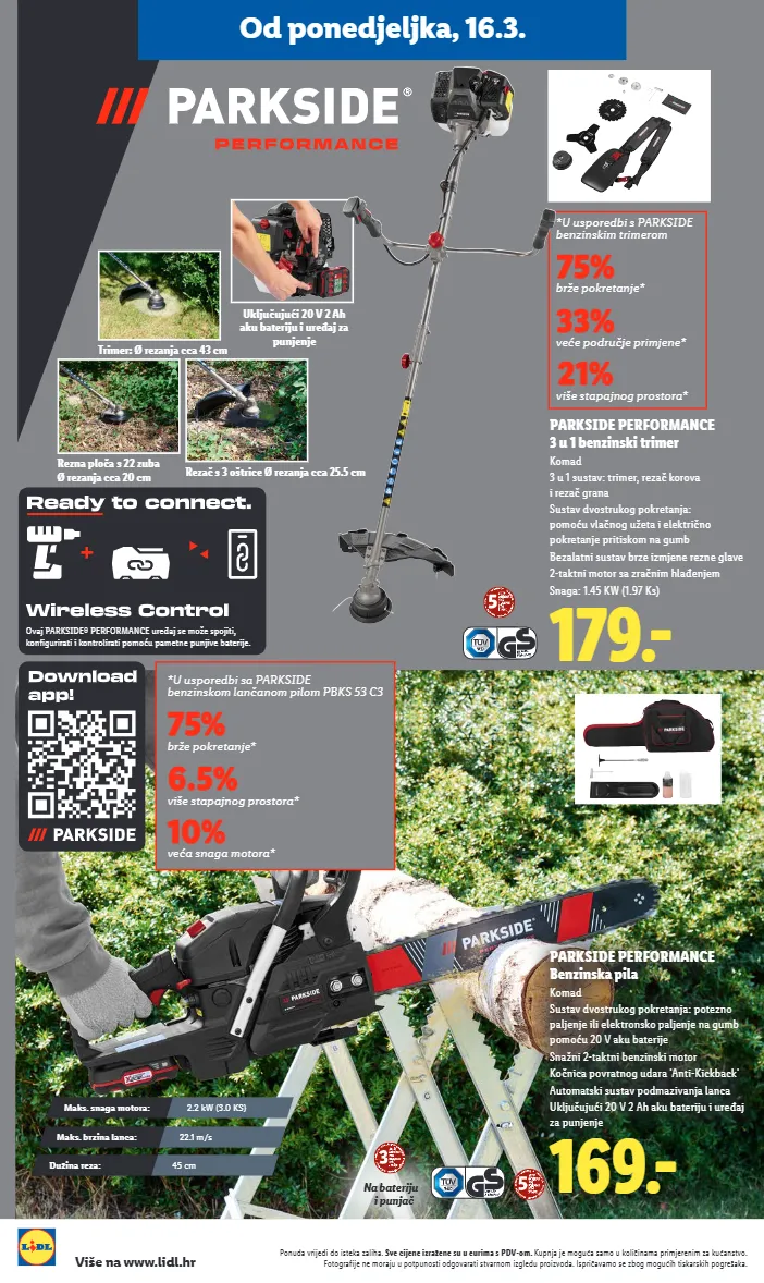 ponuda vrijedi do isteka zaliha. sve cijene izražene su u eurima s pdv-om. kupnja je moguća samo u količinama primjerenim za kućanstvo. fotografije ne moraju u potpunosti odgovarati stvarnom izgledu proizvoda. ispričavamo se zbog mogućih tiskarskih pogrešaka. više na www.lidl.hr *u usporedbi sa parkside benzinskom lančanom pilom pbks 53 c3 75% 75% brže pokretanje* 6.5% 6.5% više stapajnog prostora* 10% 10% veća snaga motora* ovaj parkside® performance uređaj se može spojiti, konfigurirati i kontrolirati pomoću pametne punjive baterije. parkside performance benzinska pila komad sustav dvostrukog pokretanja: potezno paljenje ili elektronsko paljenje na gumb pomoću 20 v aku baterije snažni 2-taktni benzinski motor kočnica povratnog udara 'anti-kickback' automatski sustav podmazivanja lanca uključujući 20 v 2 ah aku bateriju i uređaj za punjenje 169.- na bateriju i punjač maks. snaga motora: 2.2 kw (3.0 ks) maks. brzina lanca: 22.1 m/s dužina reza: 45 cm od ponedjeljka, 16.3. *u usporedbi s parkside benzinskim trimerom 75% 75% brže pokretanje* 33% 33% veće područje primjene* 21% 21% više stapajnog prostora* parkside performance 3 u 1 benzinski trimer komad 3 u 1 sustav: trimer, rezač korova i rezač grana sustav dvostrukog pokretanja: pomoću vlačnog užeta i električno pokretanje pritiskom na gumb bezalatni sustav brze izmjene rezne glave 2-taktni motor sa zračnim hlađenjem snaga: 1.45 kw (1.97 ks) 179.- uključujući 20 v 2 ah aku bateriju i uređaj za punjenje rezač s 3 oštrice ø rezanja cca 25.5 cm trimer: ø rezanja cca 43 cm rezna ploča s 22 zuba ø rezanja cca 20 cm