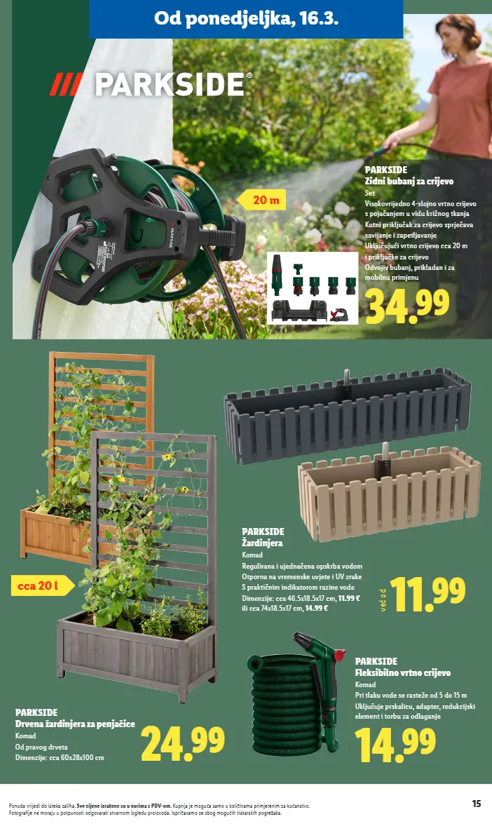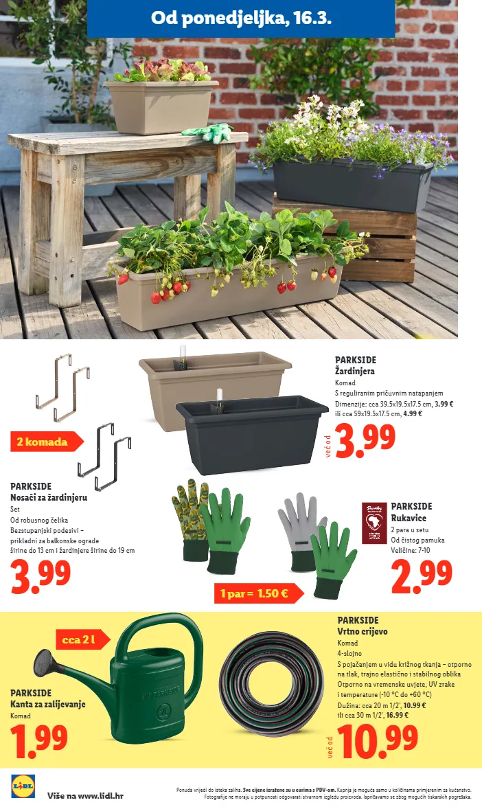 ponuda vrijedi do isteka zaliha. sve cijene izražene su u eurima s pdv-om. kupnja je moguća samo u količinama primjerenim za kućanstvo. fotografije ne moraju u potpunosti odgovarati stvarnom izgledu proizvoda. ispričavamo se zbog mogućih tiskarskih pogrešaka. više na www.lidl.hr 2.99 p arkside rukavice 2 para u setu od čistog pamuka veličine: 7-10 1.99 p arkside kanta za zalijevanje komad cca 2 l 3.99 p arkside nosači za žardinjeru set od robusnog čelika bezstupanjski podesivi – prikladni za balkonske ograde širine do 13 cm i žardinjere širine do 19 cm 2 komada već od parkside žardinjera komad s reguliranim pričuvnim natapanjem dimenzije: cca 39.5x19.5x17.5 cm, 3.99 € ili cca 59x19.5x17.5 cm, 4.99 € 3.99 p arkside vrtno crijevo komad 4-slojno s pojačanjem u vidu križnog tkanja – otporno na tlak, trajno elastično i stabilnog oblika otporno na vremenske uvjete, uv zrake i temperature (-10 °c do +60 °c) dužina: cca 20 m 1/2', 10.99 € ili cca 30 m 1/2', 16.99 € 10.99 već od od ponedjeljka, 16.3. 1 par = 1.50 €