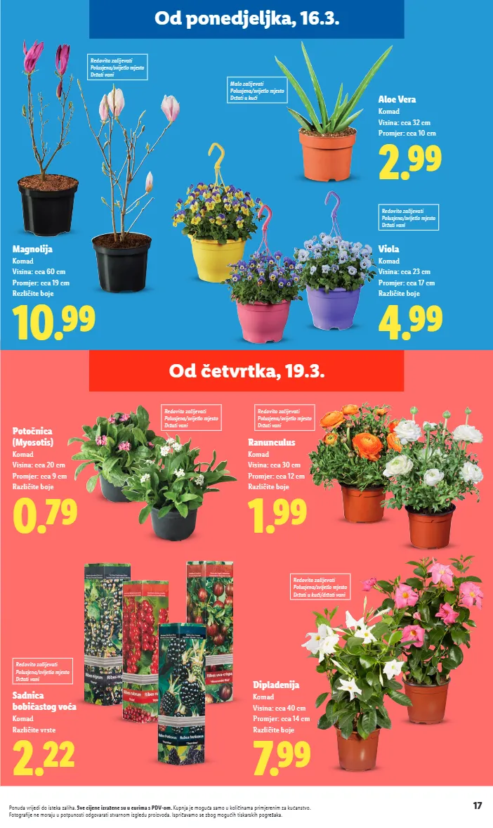 17 Ponuda vrijedi do isteka zaliha. Sve cijene izražene su u eurima s PDV-om. Kupnja je moguća samo u količinama primjerenim za kućanstvo. Fotografije ne moraju u potpunosti odgovarati stvarnom izgledu proizvoda. Ispričavamo se zbog mogućih tiskarskih pogrešaka. Od ponedjeljka, 16.3. 2.99 Aloe Vera Komad Visina: cca 32 cm Promjer: cca 10 cm 4.99 Viola Komad Visina: cca 23 cm Promjer: cca 17 cm Različite boje 10.99 Magnolija Komad Visina: cca 60 cm Promjer: cca 19 cm Rezličite boje Malo zalijevati Polusjena/svijetlo mjesto Držati u kući Redovito zalijevati Polusjena/svijetlo mjesto Držati vani Redovito zalijevati Polusjena/svijetlo mjesto Držati vani Od četvrtka, 19.3. 0.79 Potočnica (Myosotis) Komad Visina: cca 20 cm Promjer: cca 9 cm Različite boje 1.99 Ranunculus Komad Visina: cca 30 cm Promjer: cca 12 cm Različite boje 7.99 Dipladenija Komad Visina: cca 40 cm Promjer: cca 14 cm Različite boje 2.22 Sadnica bobičastog voća Komad Različite vrste Redovito zalijevati Polusjena/svijetlo mjesto Držati vani Redovito zalijevati Polusjena/svijetlo mjesto Držati vani Redovito zalijevati Polusjena/svijetlo mjesto Držati u kući/držati vani Redovito zalijevati Polusjena/svijetlo mjesto Držati vani