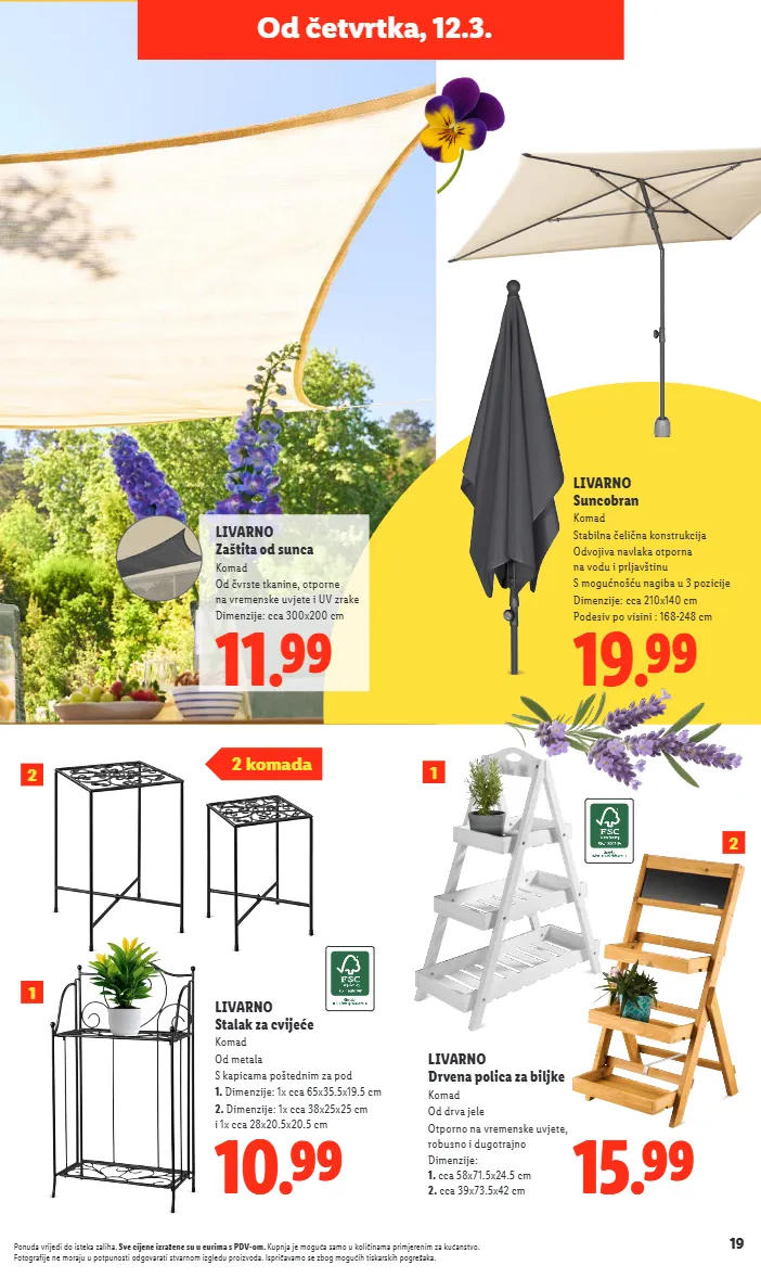 livarno drvena polica za biljke komad od drva jele otporno na vremenske uvjete, robusno i dugotrajno dimenzije: 1. cca 58x71.5x24.5 cm 2. cca 39x73.5x42 cm livarno stalak za cvijeće komad od metala s kapicama poštednim za pod 1. dimenzije: 1x cca 65x35.5x19.5 cm 2. dimenzije: 1x cca 38x25x25 cm i 1x cca 28x20.5x20.5 cm 2 komada 10.99 2 15.99 1 2 od četvrtka, 12.3. 11.99 livarno® zaštita od sunca komad od čvrste tkanine, otporne na vremenske uvjete i uv zrake dimenzije: cca 300x200 cm 495443 19.99 livarno suncobran komad stabilna čelična konstrukcija odvojiva navlaka otporna na vodu i prljavštinu s mogućnošću nagiba u 3 pozicije dimenzije: cca 210x140 cm 518820 1 2 komada 10.99 2 15.99 1 2 od četvrtka, 12.3. 19.99 livarno suncobran komad stabilna čelična konstrukcija odvojiva navlaka otporna na vodu i prljavštinu s mogućnošću nagiba u 3 pozicije dimenzije: cca 210x140 cm podesiv po visini : 168-248 cm 1 11.99 livarno zaštita od sunca komad od čvrste tkanine, otporne na vremenske uvjete i uv zrake dimenzije: cca 300x200 cm 19 ponuda vrijedi do isteka zaliha. sve cijene izražene su u eurima s pdv-om. kupnja je moguća samo u količinama primjerenim za kućanstvo. fotografije ne moraju u potpunosti odgovarati stvarnom izgledu proizvoda. ispričavamo se zbog mogućih tiskarskih pogrešaka.