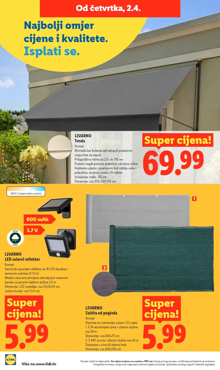 ponuda vrijedi do isteka zaliha. sve cijene izražene su u eurima s pdv-om. kupnja je moguća samo u količinama primjerenim za kućanstvo. fotografije ne moraju u potpunosti odgovarati stvarnom izgledu proizvoda. ispričavamo se zbog mogućih tiskarskih pogrešaka. više na www.lidl.hr najbolji omjer cijene i kvalitete. isplati se. od četvrtka, 2.4. livarno tenda komad montaža bez bušenja zahvaljujući podesivim stupovima na napon prilagodljiva visina od 220 do 310 cm podesiv nagib pomoću praktične odvojive ručice kvalitetno platno s premazom koji odbija vodu i prljavštinu te pruža visoku uv zaštitu izvlačenje: maks. 150 cm dimenzije: cca 300x220-310 cm 69.99 super cijena! livarno led solarni reflektor komad senzorski upravljan reflektor sa 16 led žaruljica i senzorom pokreta (5-12 m) mrežno neovisna primjena zahvaljujući solarnom panelu sa spojnim kablom dužine 2.5 m dimenzije: led svjetiljka: cca 10x10x10 cm, solarni modul: cca 11x11 cm 5.99 super cijena! livarno zaštita od pogleda komad otporna na vremenske uvjete i uv zrake 1. s 24 aluminijske ušice i užetom dužine cca 24 m dimenzije: cca 600x75 cm 2. s 440 otvora i užetom dužine cca 24 m dostupna u sivoj ili zelenoj boji dimenzije: cca 500x100 cm 5.99 super cijena! i p 4 4 i p 4 4 1 2 6500 k (hladno bijelo svijetlo) 3.7 v 600 mah