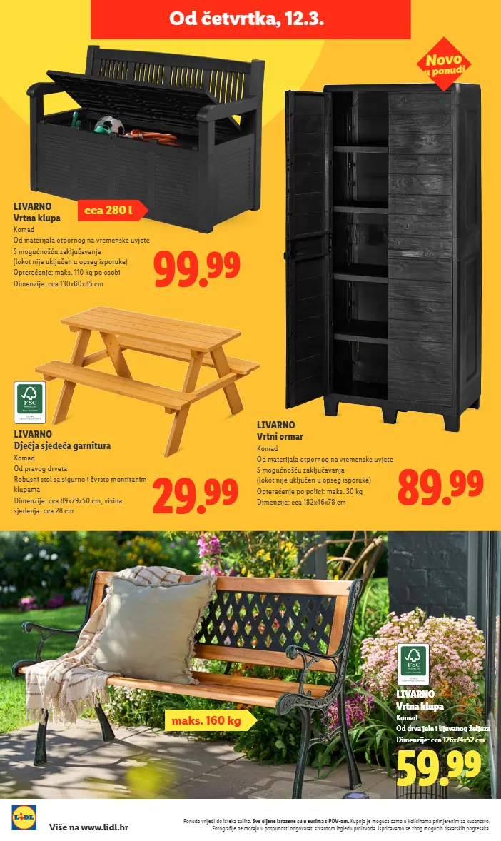 od četvrtka, 12.3. livarno dječja sjedeća garnitura komad od pravog drveta robusni stol sa sigurno i čvrsto montiranim klupama dimenzije: cca 89x79x50 cm, visina sjedenja: cca 28 cm livarno vrtna klupa komad od materijala otpornog na vremenske uvjete s mogućnošću zaključavanja (lokot nije uključen u opseg isporuke) opterećenje: maks. 110 kg po osobi dimenzije: cca 130x60x85 cm od četvrtka, 12.3. 89.99 livarno vrtni ormar komad od materijala otpornog na vremenske uvjete s mogućnošću zaključavanja (lokot nije uključen u opseg isporuke) opterećenje po polici: maks. 30 kg dimenzije: cca 182x46x78 cm 99.99 cca 280 l 29.99 maks. 160 kg livarno vrtna klupa komad od drva jele i lijevanog željeza dimenzije: cca 126x74x52 cm 59.99 od četvrtka, 12.3. 89.99 99.99 cca 280 l 29.99 maks. 160 kg livarno vrtna klupa komad od drva jele i lijevanog željeza dimenzije: cca 126x74x52 cm 59.99 novo u ponudi ponuda vrijedi do isteka zaliha. sve cijene izražene su u eurima s pdv-om. kupnja je moguća samo u količinama primjerenim za kućanstvo. fotografije ne moraju u potpunosti odgovarati stvarnom izgledu proizvoda. ispričavamo se zbog mogućih tiskarskih pogrešaka. više na www.lidl.hr