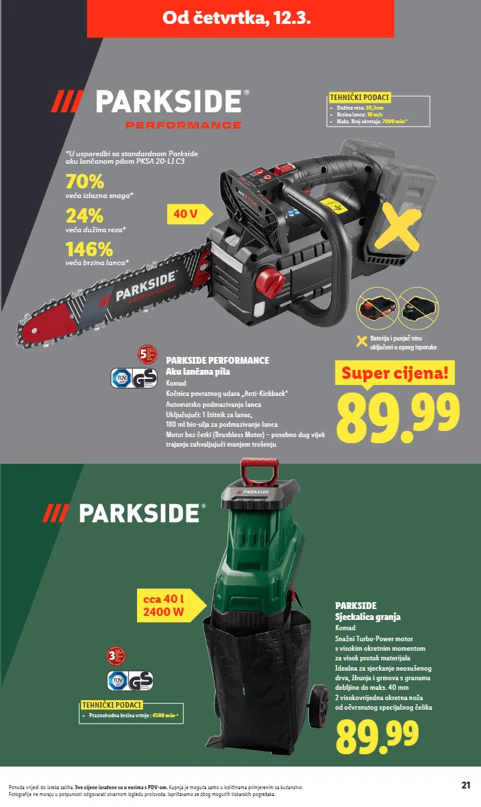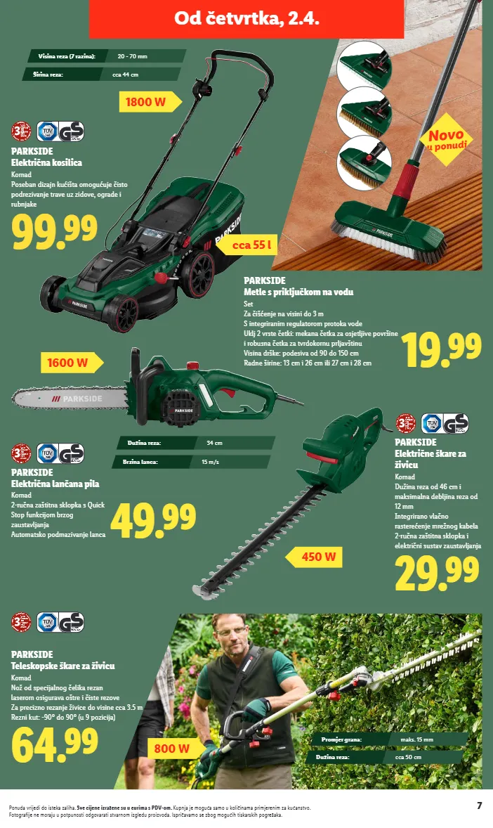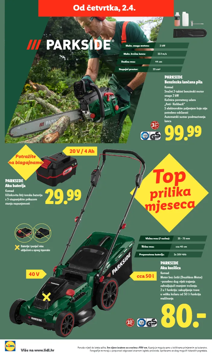 ponuda vrijedi do isteka zaliha. sve cijene izražene su u eurima s pdv-om. kupnja je moguća samo u količinama primjerenim za kućanstvo. fotografije ne moraju u potpunosti odgovarati stvarnom izgledu proizvoda. ispričavamo se zbog mogućih tiskarskih pogrešaka. više na www.lidl.hr od četvrtka, 2.4. 99.99 parkside benzinska lančana pila komad snažni 2-taktni benzinski motor snage 2 kw kočnica povratnog udara „anti- kickback“ s elektronskim paljenjem koje nije potrebno održavati automatski sustav podmazivanja lanca parkside aku kosilica komad motor bez četki (brushless motor) –posebno dug vijek trajanja zahvaljujući manjem trošenju 2 u 1 funkcija: sakupljanje trave u veliku košaru od 50 l i funkcija malčiranja top prilika mjeseca maks. snaga motora: 2 kw maks. brzina lanca: 22.1 m/s dužina reza: 44 cm stapajni prostor: 53 cm 3 baterija i punjač nisu uključeni u opseg isporuke 80.- visina reza (7 razina): 25 - 75 mm širina reza: cca 40 cm preporučena baterija: 2x 20v 4ah 29.99 parkside aku baterija komad učinkovita litij-ionska baterija s 3-stupanjskim prikazom stanja napunjenosti 20 v / 4 ah cca 50 l 40 v potražite na blagajnama
