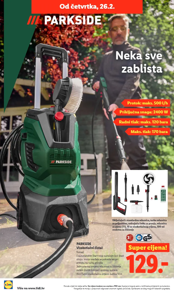 Ponuda vrijedi do isteka zaliha. Sve cijene izražene su u eurima s PDV-om. Kupnja je moguća samo u količinama primjerenim za kućanstvo. Fotografije ne moraju u potpunosti odgovarati stvarnom izgledu proizvoda. Ispričavamo se zbog mogućih tiskarskih pogrešaka. Više na www.lidl.hr Od četvrtka, 26.2. 482149 129.- S uper cijena ! PARKSIDE Visokotlačni čistač Komad S automatskim Start-stop sustavom koji štedi struju: motor uređaja se pokreće tek pri pritisku na ručku pištolja Jednostavna izmjena mlaznica za čišćenje putem Quick-Connect spojnog sustava Anti-Twist visokotlačno crijevo dužine 10 m Priključna snaga: 2400 W Maks. tlak: 170 bara Radni tlak: maks. 120 bara Protok: maks. 500 l/h Neka sve zablista Od četvrtka, 26.2. Uključujući: standardna mlaznica, turbo mlaznica za prljavštinu, rotirajuća četka za pranje, mlaznica za pjenu (1 l), 10 m visokotlačnog crijeva, 500 ml sredstva za čišćenje