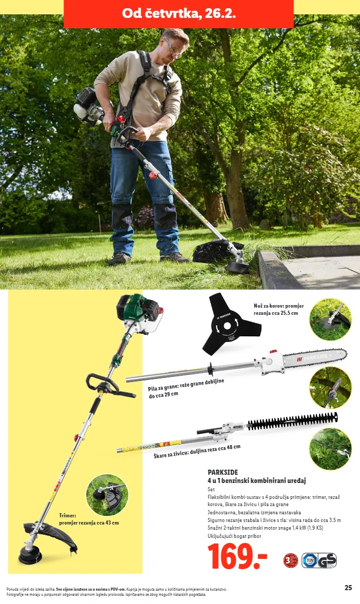 25 ponuda vrijedi do isteka zaliha. sve cijene izražene su u eurima s pdv-om. kupnja je moguća samo u količinama primjerenim za kućanstvo. fotografije ne moraju u potpunosti odgovarati stvarnom izgledu proizvoda. ispričavamo se zbog mogućih tiskarskih pogrešaka. 169.- parkside 4 u 1 benzinski kombinirani uređaj set fleksibilni kombi-sustav s 4 područja primjene: trimer, rezač korova, škare za živicu i pila za grane jednostavna, bezalatna izmjena nastavaka sigurno rezanje stabala i živice s tla: visina rada do cca 3.5 m snažni 2-taktni benzinski motor snage 1.4 kw (1.9 ks) uključujući bogat pribor trimer: promjer rezanja cca 43 cm nož za korov: promjer rezanja cca 25.5 cm pila za grane: reže grane debljine do cca 29 cm škare za živicu: duljina reza cca 48 cm od četvrtka, 26.2.