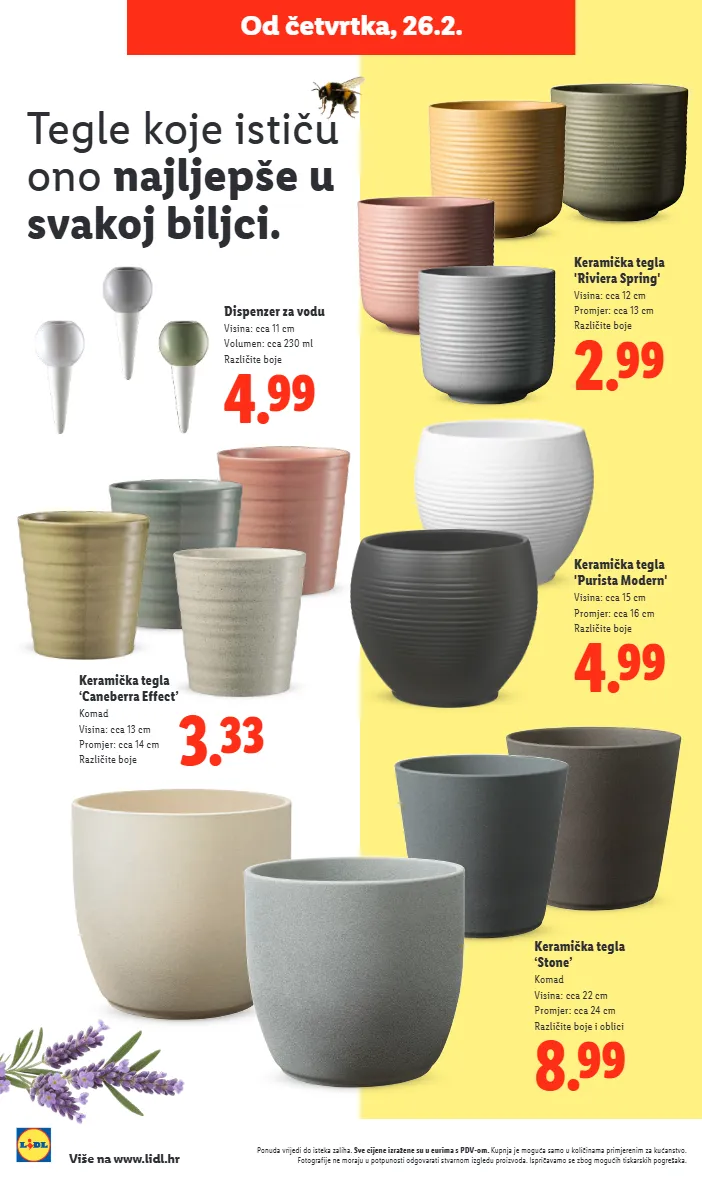 ponuda vrijedi do isteka zaliha. sve cijene izražene su u eurima s pdv-om. kupnja je moguća samo u količinama primjerenim za kućanstvo. fotografije ne moraju u potpunosti odgovarati stvarnom izgledu proizvoda. ispričavamo se zbog mogućih tiskarskih pogrešaka. više na www.lidl.hr 4.99 dispenzer za vodu visina: cca 11 cm volumen: cca 230 ml različite boje 2.99 keramička tegla 'riviera spring' visina: cca 12 cm promjer: cca 13 cm različite boje 4.99 keramička tegla 'purista modern' visina: cca 15 cm promjer: cca 16 cm različite boje keramička tegla ‘caneberra effect’ komad visina: cca 13 cm promjer: cca 14 cm različite boje 3.33 keramička tegla ‘stone’ komad visina: cca 22 cm promjer: cca 24 cm različite boje i oblici 8.99 tegle koje ističu ono najljepše u svakoj biljci. od četvrtka, 26.2.
