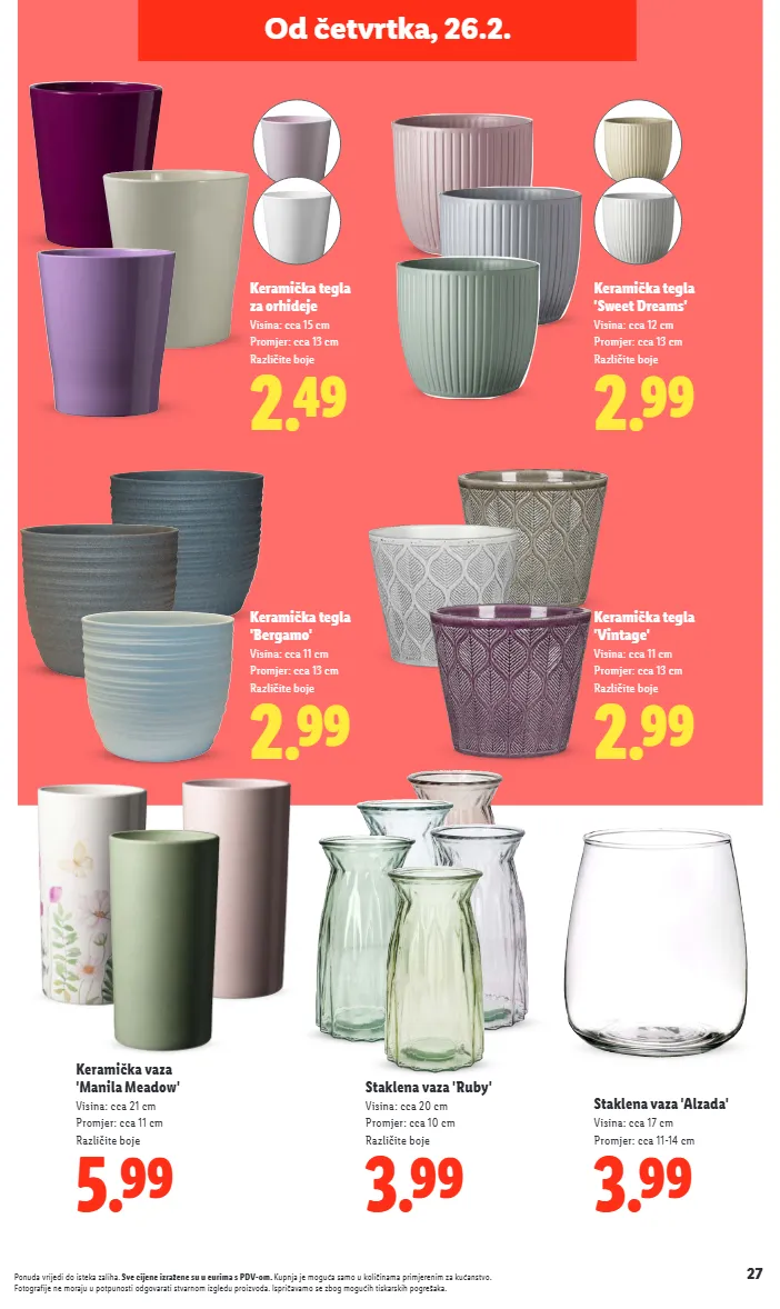 27 ponuda vrijedi do isteka zaliha. sve cijene izražene su u eurima s pdv-om. kupnja je moguća samo u količinama primjerenim za kućanstvo. fotografije ne moraju u potpunosti odgovarati stvarnom izgledu proizvoda. ispričavamo se zbog mogućih tiskarskih pogrešaka. od četvrtka, 26.2. 3.99 staklena vaza 'ruby' visina: cca 20 cm promjer: cca 10 cm različite boje 3.99 staklena vaza 'alzada' visina: cca 17 cm promjer: cca 11-14 cm 5.99 keramička vaza 'manila meadow' visina: cca 21 cm promjer: cca 11 cm različite boje 2.99 keramička tegla 'sweet dreams' visina: cca 12 cm promjer: cca 13 cm različite boje 2.49 keramička tegla za orhideje visina: cca 15 cm promjer: cca 13 cm različite boje 2.99 keramička tegla 'bergamo' visina: cca 11 cm promjer: cca 13 cm različite boje 2.99 keramička tegla 'vintage' visina: cca 11 cm promjer: cca 13 cm različite boje