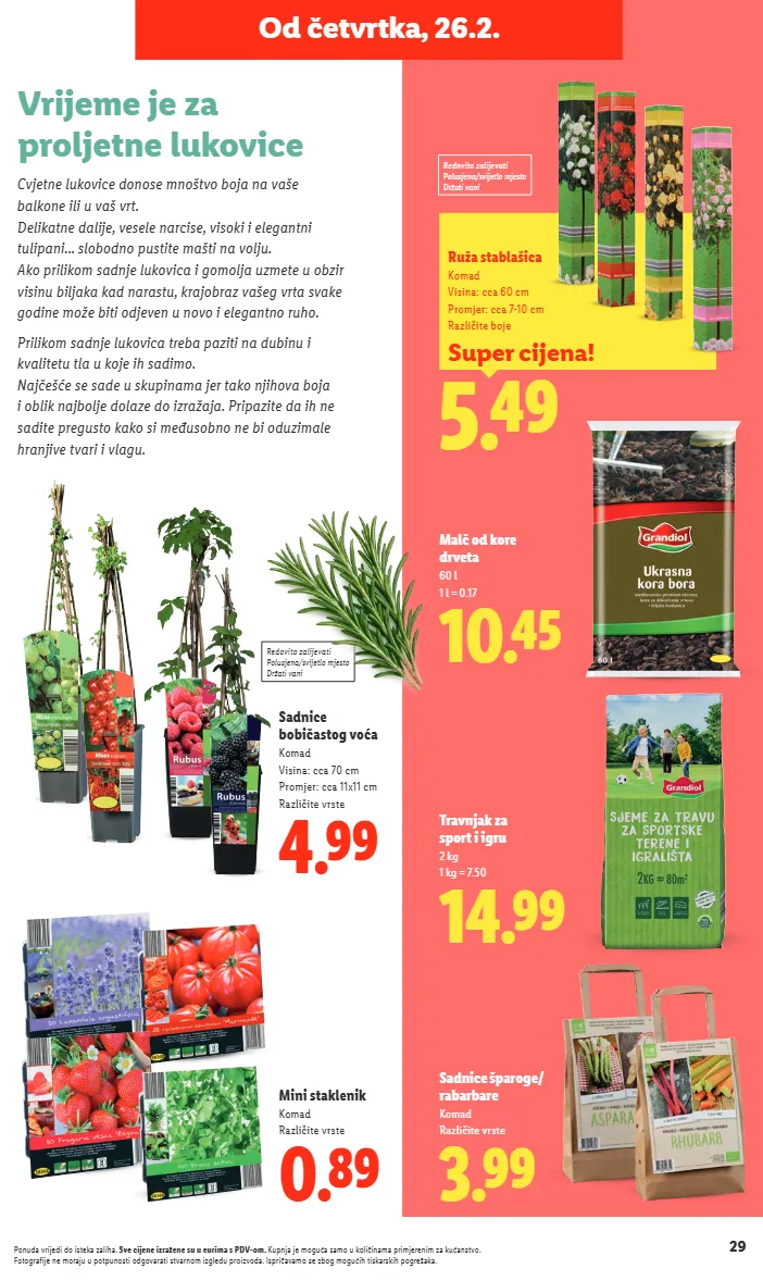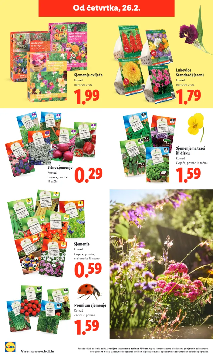 ponuda vrijedi do isteka zaliha. sve cijene izražene su u eurima s pdv-om. kupnja je moguća samo u količinama primjerenim za kućanstvo. fotografije ne moraju u potpunosti odgovarati stvarnom izgledu proizvoda. ispričavamo se zbog mogućih tiskarskih pogrešaka. više na www.lidl.hr od četvrtka, 26.2. sjemenje cvijeća komad različite vrste 1.99 lukovice standard (jesen) komad različite vrste 1.79 sitno sjemenje komad cvijeće, povrće ili začini 0.29 sjemenje komad cvijeće, povrće, mahunarke ili razno 0.59 premium sjemenje komad začini ili povrće 1.59 sjemenje na traci ili disku komad cvijeće, povrće ili začini 1.59