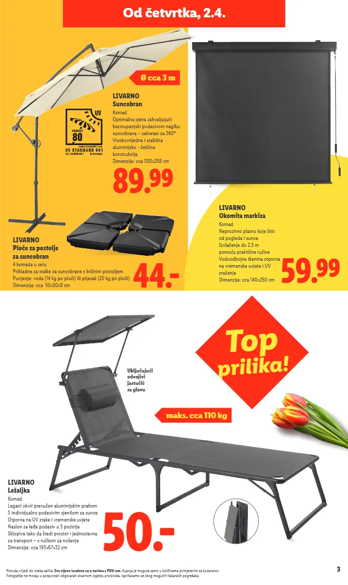 3 ponuda vrijedi do isteka zaliha. sve cijene izražene su u eurima s pdv-om. kupnja je moguća samo u količinama primjerenim za kućanstvo. fotografije ne moraju u potpunosti odgovarati stvarnom izgledu proizvoda. ispričavamo se zbog mogućih tiskarskih pogrešaka. od četvrtka, 2.4. livarno ležaljka komad lagani okvir prevučen aluminijskim prahom s individualno podesivim sjenilom za sunce otporna na uv zrake i vremenske uvjete naslon za leđa podesiv u 5 pozicija sklopiva tako da štedi prostor i jednostavna za transport – s ručkom za nošenje dimenzije: cca 193x67x32 cm 44.- livarno ploče za postolje za suncobran 4 komada u setu prikladne za stalke za suncobrane s križnim postoljem punjenje: voda (14 kg po ploči) ili pijesak (20 kg po ploči) dimenzije: cca 50x50x8 cm 59.99 livarno okomita markiza komad neprozirno platno koje štiti od pogleda i sunca izvlačenje do 2.5 m pomoću praktične ručice vodoodbojna tkanina otporna na vremenske uvjete i uv zračenje dimenzije: cca 140x250 cm 50.- maks. cca 110 kg uključujući odvojivi jastučić za glavu top prilika ! 89.99 livarno suncobran komad optimalna sjena zahvaljujući bezstupanjski podesivom nagibu suncobrana – zakretan za 360° visokovrijedna i stabilna aluminijsko - čelična konstrukcija dimenzije: cca 300x258 cm ø cca 3 m