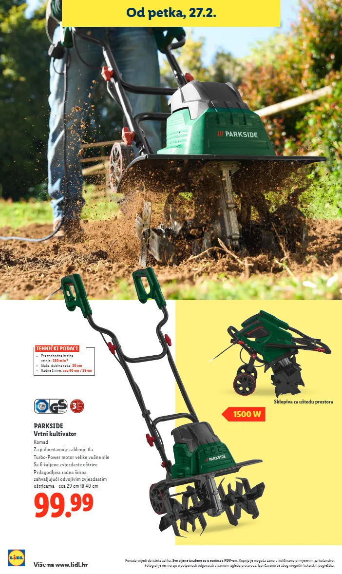 Ponuda vrijedi do isteka zaliha. Sve cijene izražene su u eurima s PDV-om. Kupnja je moguća samo u količinama primjerenim za kućanstvo. Fotografije ne moraju u potpunosti odgovarati stvarnom izgledu proizvoda. Ispričavamo se zbog mogućih tiskarskih pogrešaka. Više na www.lidl.hr Od petka, 27.2. 1500 W TEHNIČKI PODACI • Praznohodna brzina vrtnje: 380 min -2 • Maks. dubina rada: 20 cm • Radne širine: cca 40 cm / 29 cm 99.99 PARKSIDE Vrtni kultivator Komad Za jednostavnije rahlenje tla Turbo-Power motor velike vučne sile Sa 6 kaljene zvjezdaste oštrice Prilagodljiva radna širina zahvaljujući odvojivim zvjezdastim oštricama - cca 29 cm ili 40 cm Sklopiva za uštedu prostora