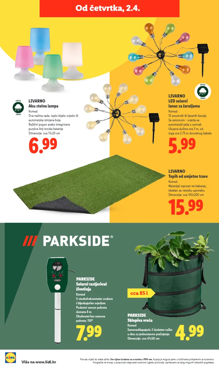 ponuda vrijedi do isteka zaliha. sve cijene izražene su u eurima s pdv-om. kupnja je moguća samo u količinama primjerenim za kućanstvo. fotografije ne moraju u potpunosti odgovarati stvarnom izgledu proizvoda. ispričavamo se zbog mogućih tiskarskih pogrešaka. više na www.lidl.hr od četvrtka, 2.4. 6.99 livarno aku stolna lampa komad dva načina rada: toplo bijelo svjetlo ili automatska izmjena boja bežični pogon preko integrirane punjive litij-ionske baterije dimenzije: cca 13x20 cm 5.99 livarno led solarni lanac sa žaruljama komad 10 prozirnih ili šarenih žarulja sa senzorom - svjetla se automatski pale u sumrak ukupna dužina cca 5 m, od toga cca 2.75 m dovodnog kabela 15.99 livarno tepih od umjetne trave komad materijal otporan na habanje, idealan za vanjsku upotrebu dimenzije: cca 100x200 cm i p 4 4 i p 4 4 i p 4 4 i p 4 4 i p 6 5 i p 6 5 7.99 parkside solarni rastjerivač životinja komad s visokofrekventnim zvukom i bljeskajućim svjetlom podesivi senzor pokreta dometa 8 m obuhvatni kut senzora pokreta: 110° 4.99 parkside sklopiva vreća komad samorasklapajuća 2 dodatne ručke u dnu za jednostavno pražnjenje dimenzije: cca 47x50 cm cca 85 l