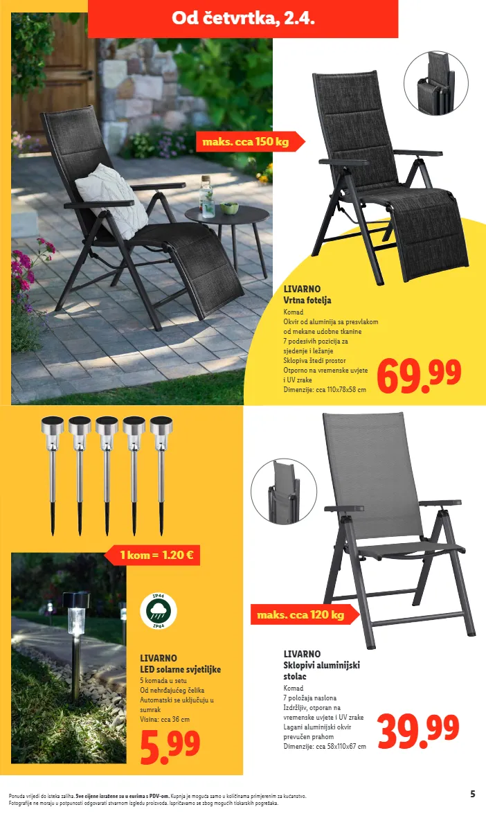 5 ponuda vrijedi do isteka zaliha. sve cijene izražene su u eurima s pdv-om. kupnja je moguća samo u količinama primjerenim za kućanstvo. fotografije ne moraju u potpunosti odgovarati stvarnom izgledu proizvoda. ispričavamo se zbog mogućih tiskarskih pogrešaka. 39.99 livarno sklopivi aluminijski stolac komad 7 položaja naslona izdržljiv, otporan na vremenske uvjete i uv zrake lagani aluminijski okvir prevučen prahom dimenzije: cca 58x110x67 cm maks. cca 120 kg 5.99 livarno led solarne svjetiljke 5 komada u setu od nehrđajućeg čelika automatski se uključuju u sumrak visina: cca 36 cm i p 4 4 i p 4 4 1 kom = 1.20 € od četvrtka, 2.4. 69.99 livarno vrtna fotelja komad okvir od aluminija sa presvlakom od mekane udobne tkanine 7 podesivih pozicija za sjedenje i ležanje sklopiva štedi prostor otporno na vremenske uvjete i uv zrake dimenzije: cca 110x78x58 cm maks. cca 150 kg