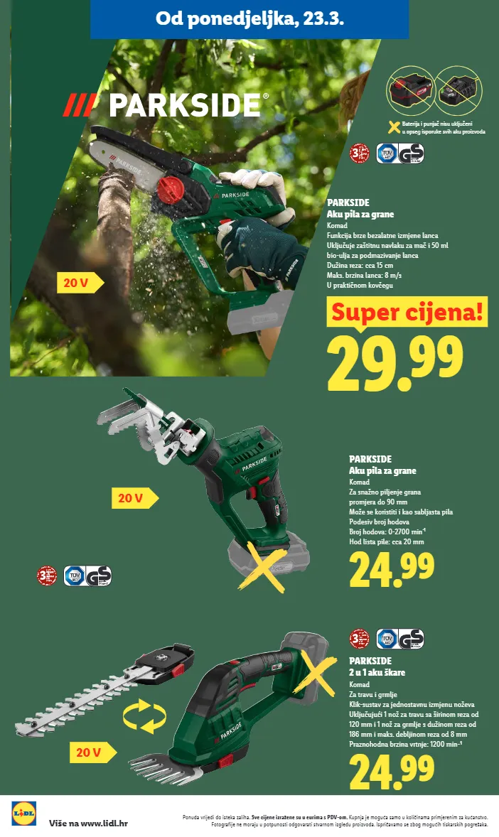 ponuda vrijedi do isteka zaliha. sve cijene izražene su u eurima s pdv-om. kupnja je moguća samo u količinama primjerenim za kućanstvo. fotografije ne moraju u potpunosti odgovarati stvarnom izgledu proizvoda. ispričavamo se zbog mogućih tiskarskih pogrešaka. više na www.lidl.hr od ponedjeljka, 23.3. parkside aku pila za grane komad funkcija brze bezalatne izmjene lanca uključuje zaštitnu navlaku za mač i 50 ml bio-ulja za podmazivanje lanca dužina reza: cca 15 cm maks. brzina lanca: 8 m/s u praktičnom kovčegu 29.99 super cijena! baterija i punjač nisu uključeni u opseg isporuke svih aku proizvoda 20 v 20 v 20 v 24.99 parkside 2 u 1 aku škare komad za travu i grmlje klik-sustav za jednostavnu izmjenu noževa uključujući 1 nož za travu sa širinom reza od 120 mm i 1 nož za grmlje s dužinom reza od 186 mm i maks. debljinom reza od 8 mm praznohodna brzina vrtnje: 1200 min-¹ 24.99 parkside aku pila za grane komad za snažno piljenje grana promjera do 90 mm može se koristiti i kao sabljasta pila podesiv broj hodova broj hodova: 0-2700 min -1 hod lista pile: cca 20 mm