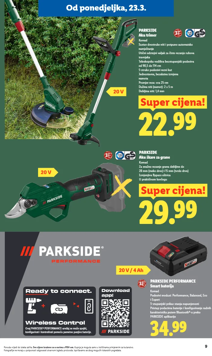 9 ponuda vrijedi do isteka zaliha. sve cijene izražene su u eurima s pdv-om. kupnja je moguća samo u količinama primjerenim za kućanstvo. fotografije ne moraju u potpunosti odgovarati stvarnom izgledu proizvoda. ispričavamo se zbog mogućih tiskarskih pogrešaka. 34.99 parkside performance smart baterija komad podesivi modusi: performance, balanced, eco i expert 3-stupanjski prikaz stanja napunjenosti pristup podacima baterije i konfiguriranje radnih karakteristika putem bluetooth®-a preko parkside aplikacije od ponedjeljka, 23.3. parkside aku škare za grane komad za snažno rezanje grana debljine do 28 mm (meko drvo) i 15 mm (tvrdo drvo) izmjenjiva bypass oštrica u praktičnom kovčegu 29.99 super cijena! parkside aku trimer komad sustav dvostruke niti i potpuno automatsko namještanje utični odstojni valjak za čisto rezanje rubova travnjaka teleskopska vodilica bezstupanjski podesiva od 90,5 do 114 cm 5-struko podesivi rezni kut jednostavna, bezalatna izmjena namota promjer reza: cca 25 cm dužina niti (namot): 2 x 5 m debljina niti: 1,4 mm 22.99 super cijena! 20 v 20 v ovaj parkside® performance uređaj se može spojiti, konfigurirati i kontrolirati pomoću pametne punjive baterije. 20 v / 4 ah