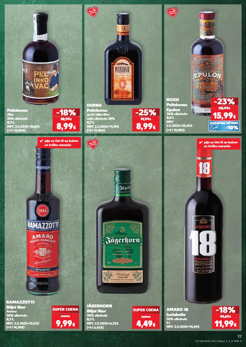 -27% 6,22 € kratkotrajna ponuda kratkotrajna ponuda kratkotrajna ponuda kratkotrajna ponuda kratkotrajna ponuda samo samo samo samo kratkotrajna ponuda samo jägerhorn biljni liker 30% alkohola 0,7 l mpc 2.5.2025=6,22€ (=1 l 6,42€) amaro 18 isolabella 30% alkohola 1 l mpc 2.5.2025=14,69€ -18% (=1 l 12,85€) darna pelinkovac gorki biljni liker udio alkohola 28% 0,7 l mpc 2.5.2025=11,39€ -25% (=1 l 12,85€) pelinkovac alte 35% alkohola 0,7 l mpc 2.5.2025=10,81€ -18% (=1 l 14,28€) ramazzotti biljni liker amaro 30% alkohola 0,7 l mpc 2.5.2025=12,52€ super cijena samo 4,49 € 11,99 € 14,69 € 8,99 € 11,99 € 8,99 € 10,99 € 9,99 € -23% (=1 l 31,98€) rossi pelinkovac epulon 30% alkohola 0,5 l mpc 2.5.2025=20,02€ 15,99 € 20,99 € -10% dodatna ušteda super cijena samo ✓ pije se čist ili sa ledom uz krišku naranče ✓ pije se čist ili sa ledom uz krišku naranče s17-hr-kw16-oc1-online1_5_4_r-1030-11 17