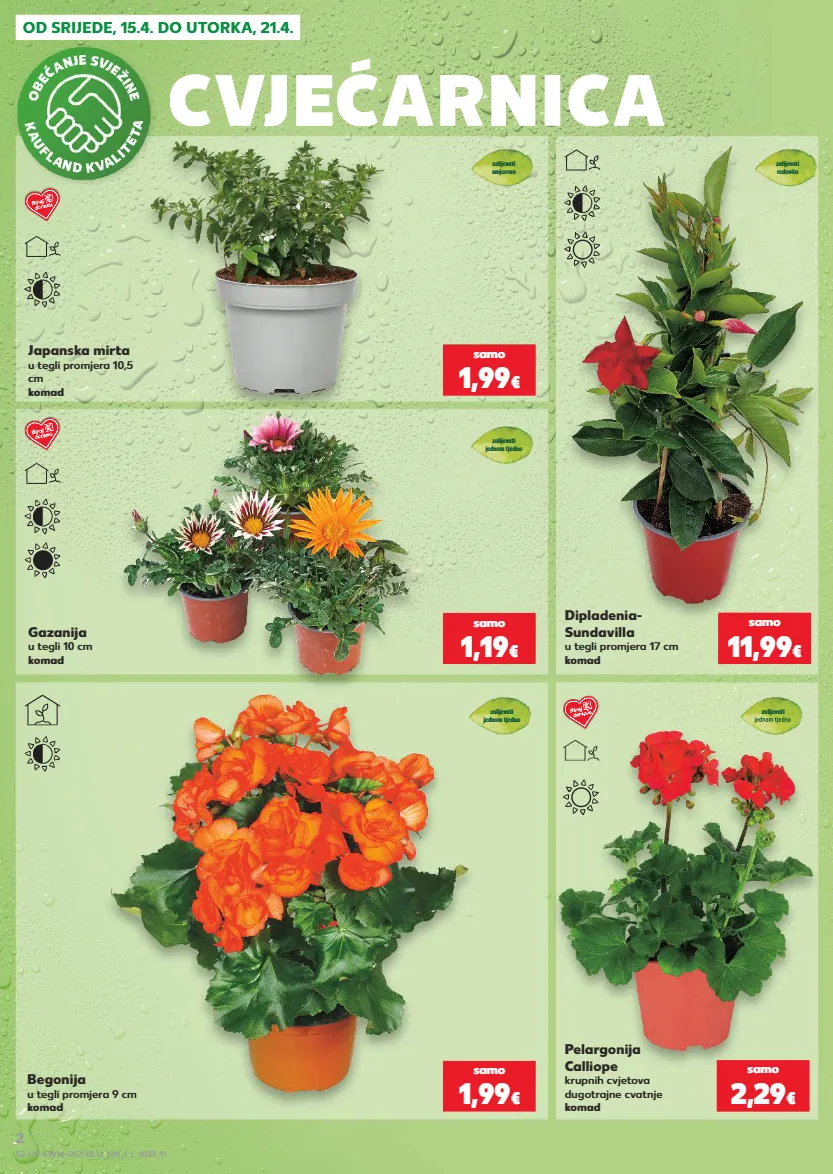 OD SRIJEDE, 15.4. DO UTORKA, 21.4. CVJEĆARNICA CVJEĆARNICA Japanska mirta u tegli promjera 10,5 cm komad Begonija u tegli promjera 9 cm komad zalijevati umjereno samo 1,99 € Gazanija u tegli 10 cm komad zalijevati jednom tjedno zalijevati jednom tjedno zalijevati jednom tjedno samo 1,19 € samo 1,99 € jednom tjedno jednom tjedno Pelargonija Calliope krupnih cvjetova dugotrajne cvatnje komad samo 2,29 € zalijevati redovito samo 11,99 € Dipladenia- Sundavilla u tegli promjera 17 cm komad S2-HR-KW16-OC1-BLU_NN_1_L-1030-11 2